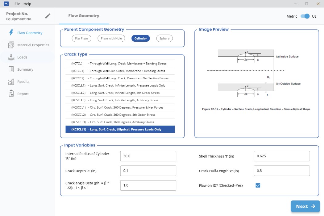Developed in-house, WJE CrackCalc™ is a software package that provides users the ability to perform fracture mechanics calculations using the methods described in API 579 / ASME FFS-1 Part 9 at much higher speeds and with more customizable options than previously available commercially.