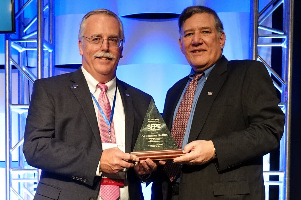 The Society of Fire Protection Engineers (SFPE) has awarded WJE Principal and Unit Manager Carl Baldassarra its 2018 John J. Ahern President’s Award. Originally created by the SFPE Board of Directors in 1987 as the President’s Award, the John J. Ahern President’s Award honors individuals whose conspicuous contributions deserve very special recognition by the Society and its leadership. Pictured is SFPE President John Harrington presenting the award to Carl Baldassarra at the Society’s annual conference in Nashville on October 29.
