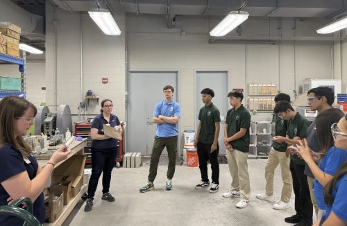 Materials engineer Elizabeth Wagner welcomed everyone to the concrete lab, where she explained that her colleagues were engaged in understanding how to make the strongest, most durable concrete for projects. Students handled materials that could be mixed into concrete, such as gypsum and fly ash. Then, petrographer Corrie Piehowski showed students the Thermotron and explained how it can simulate environmental exposure for materials before she led the students through other areas.