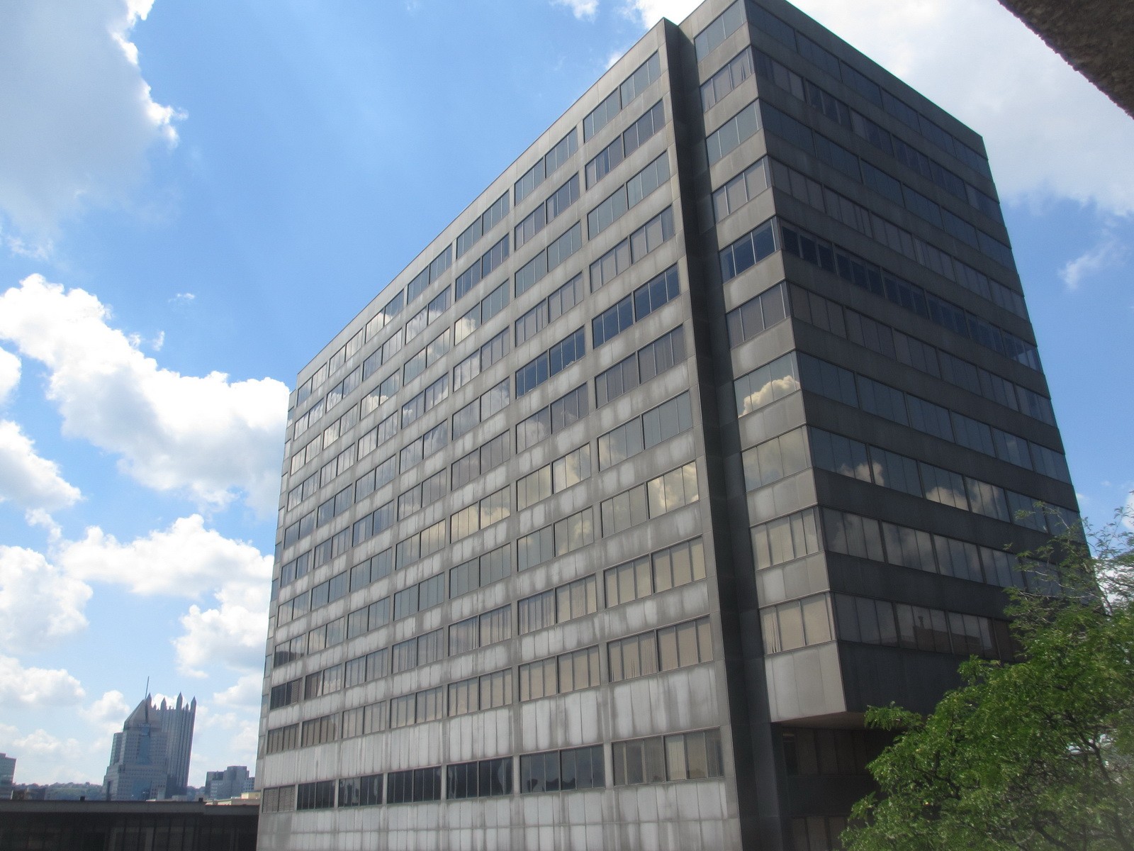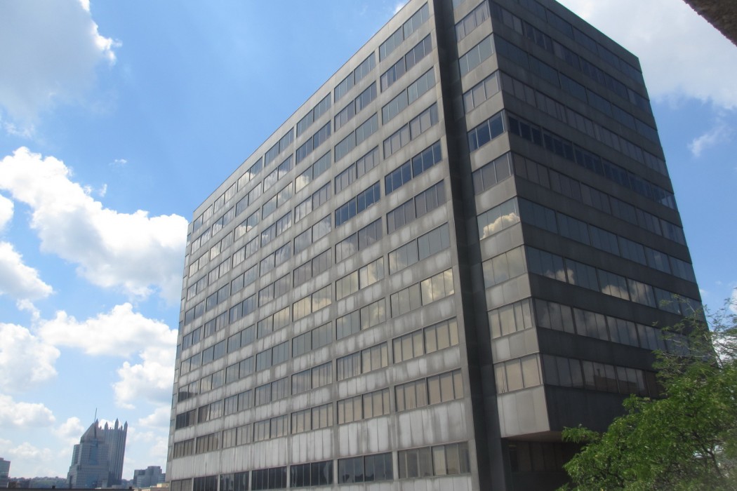 Two Allegheny Center is a thirteen-story high-rise in Pittsburgh’s North Shore district. The steel-framed structure was built in the 1970s and is primarily clad with glazed aluminum-framed fenestration and aluminum-faced, insulated spandrel panels. The roofing consists of ballasted single-ply EPDM membrane.