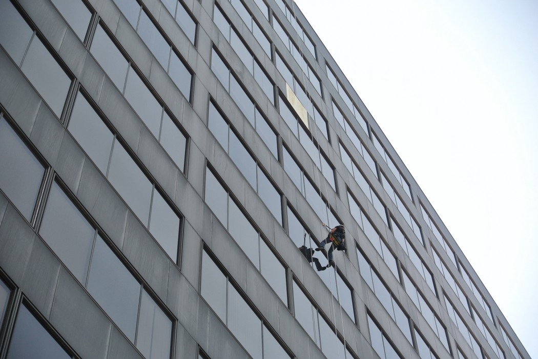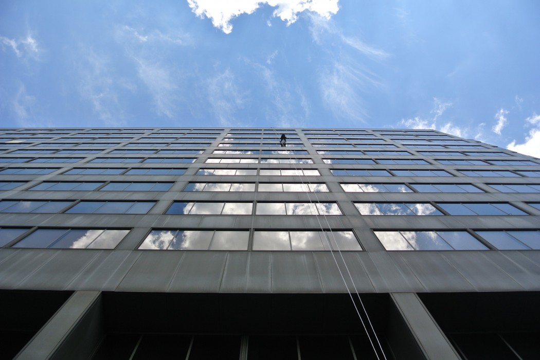 WJE’s investigation included a document review of original architectural and structural drawings as well as vintage product literature as they pertain to the metal spandrel panels, an infrared thermography survey, and a visual condition survey that included a close range visual survey of the metal spandrel panels. In order to perform the close range assessment, WJE’s Difficult Access Team was called upon to use rappelling, climbing, and rope techniques to perform the investigation. At each rope drop location, WJE assessed the condition of the sealant, exposed insulation, spandrel panels and anchorage, and performed limited testing to determine if thermal anomalies relate to delaminated aluminum facers.