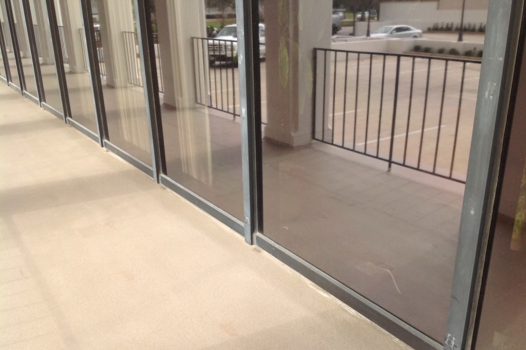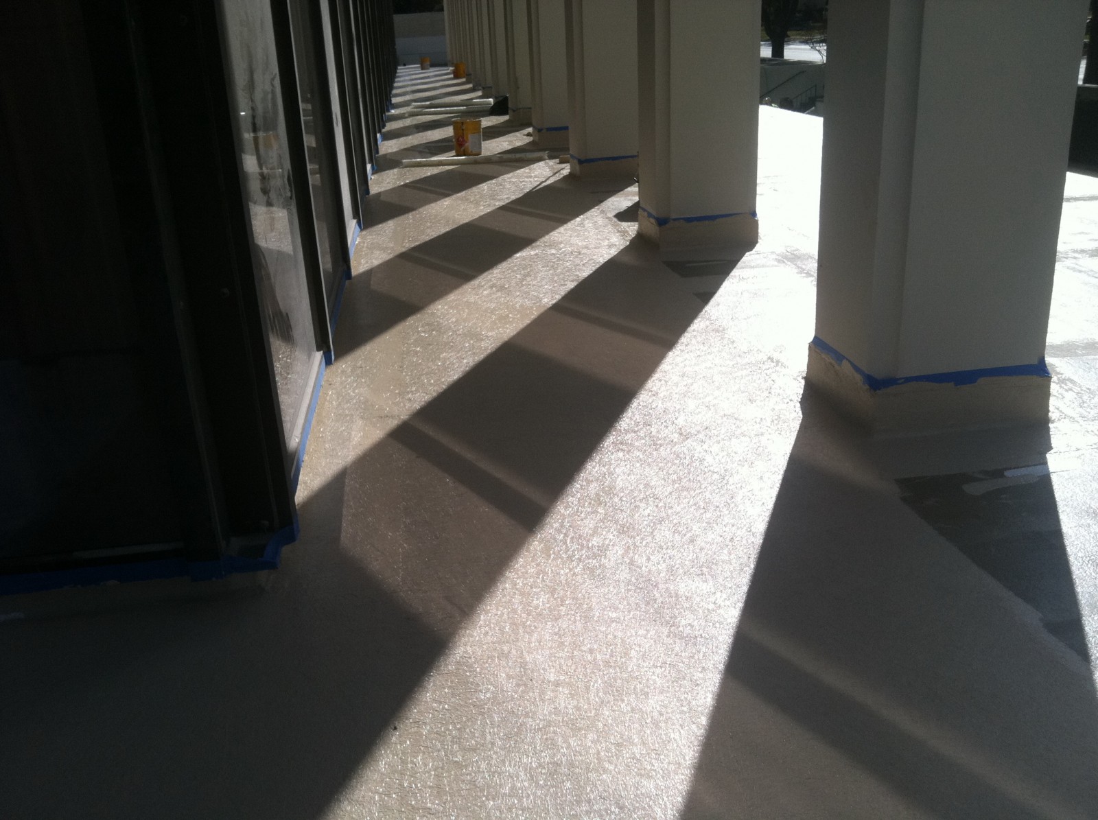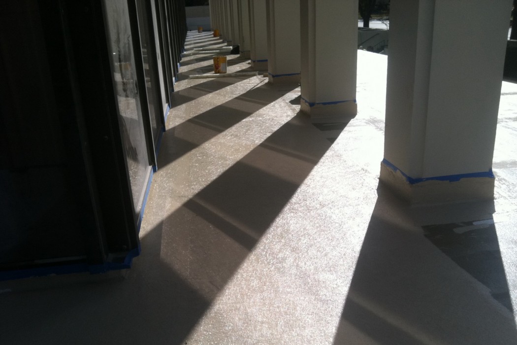 WJE developed waterproofing repair documents intended to eliminate the water leaks at the occupied spaces below the first floor breezeway with considerations for minimizing disruptions to the tenants during the repair work. The waterproofing repair developed by WJE consisted of removing the existing concrete topping slab placed on the breezeway concrete structure, routing and sealing cracks on the concrete deck, placing a new concrete topping, and applying a liquid-applied waterproofing membrane over the topping slab. A decorative top coat with broadcast aggregate was specified to address the aesthetic requirements of the project. Also, at the main entrance of the building where the owner elected to place limestone pavers, WJE developed repair documents for a below-grade liquid-applied waterproofing system.