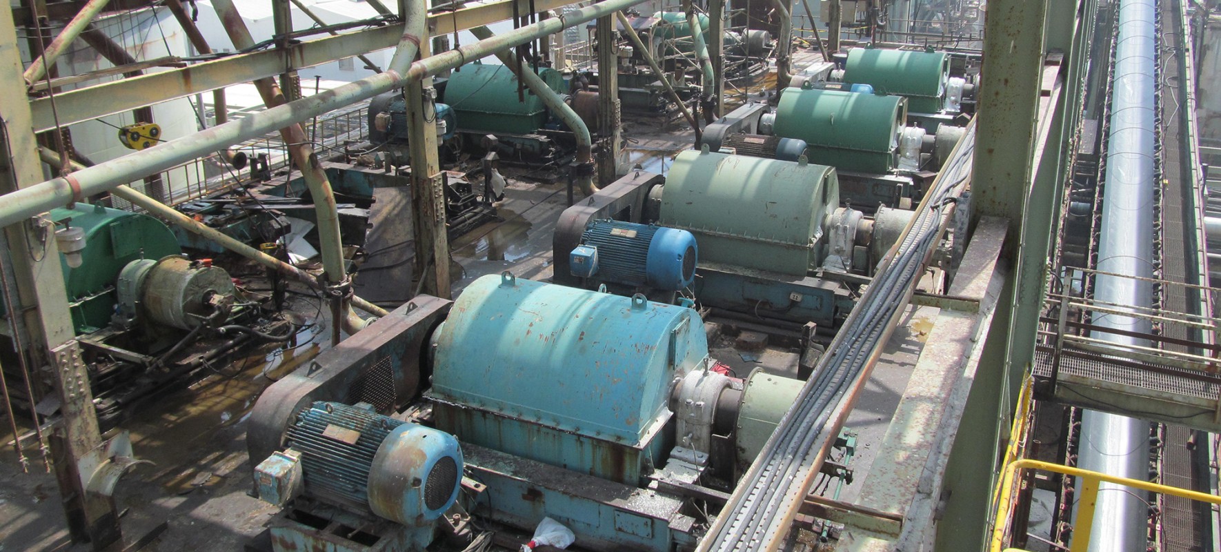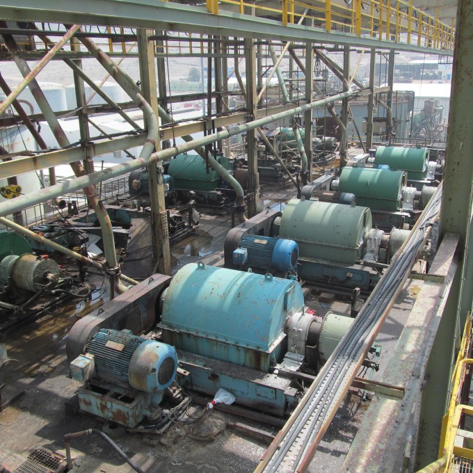 Long-term exposure to hot leach product (HLP) led to advanced deterioration of the concrete slab and supporting steel framing as well as deterioration of the concrete surface paste and corrosion of the embedded reinforcing steel. The supporting steel beams, columns, and bracing members exhibited advanced localized corrosion where the HLP product was allowed to pond. WJE was tasked with designing a replacement concrete slab capable of resisting the deleterious effects of the HLP while being able to support the dynamic loads from the centrifuge machines.