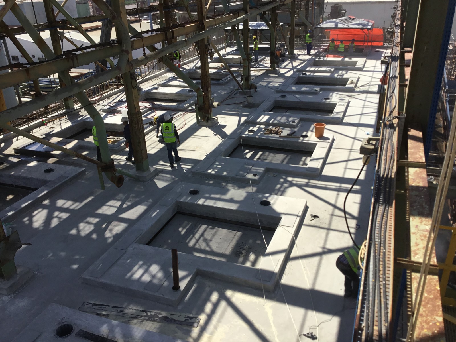 The new slab was reinforced with only glass fiber-reinforced polymer (GFRP) reinforcing bars. Although GFRP bars have been used in the past in structures exposed to chlorides, they had never been used in this application. Unlike steel bars, the GFRP bars exhibit nonductile fracture failures and are sensitive to low levels of sustained and cyclic loading. As such, WJE's design included an evaluation of these effects, including estimates of dynamic/cyclic loads from the operation of the centrifuge machines. The slab concrete was designed to be relatively impermeable, and included considerations for locally available materials. To prevent deterioration of the concrete surface paste, the slab design included topping with a resinous protective system. Exposed steel elements were cleaned and coated with a three-coat high-performance marine paint.