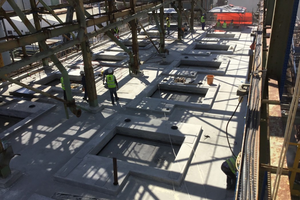 WJE was on-site during construction to review installation of the GFRP rebar, specify steel repairs, and resolve other construction issues. The vibrational performance of the slab and GFRP bars were verified by dynamic sensors that had been embedded in the slab.