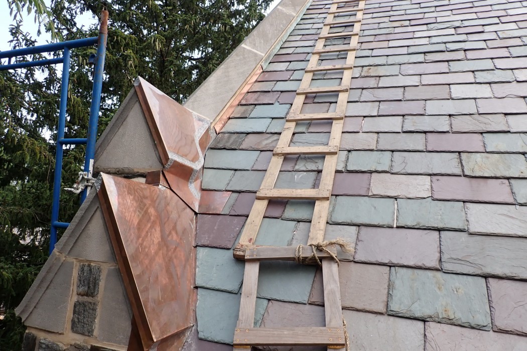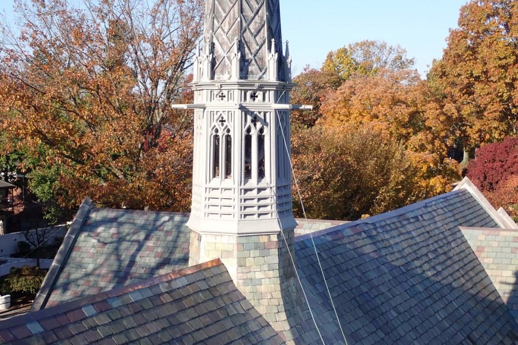 Unwilling to address individual leaks, contractors had recommended total replacement of the church’s slate roof in 2018. Seeking a second opinion, the church retained WJE to assess the condition of its various roof systems. Starting with field survey work, including a thorough walkthrough to understand the nature of the leaks and small test openings to evaluate the slate shingles, it became apparent that natural weathering, deferred maintenance, and localized deficiencies in original detailing were the cause of most of the water infiltration issues.