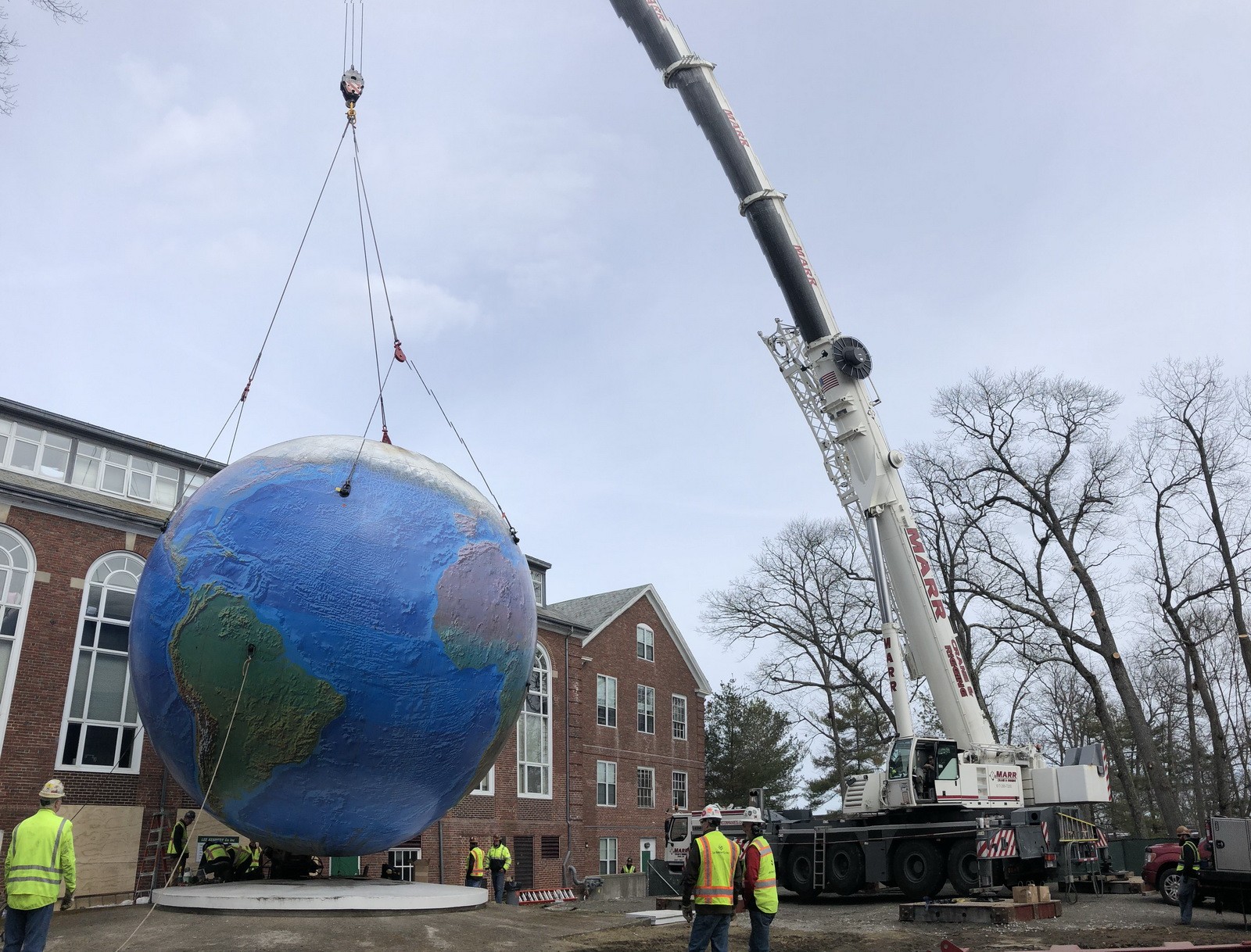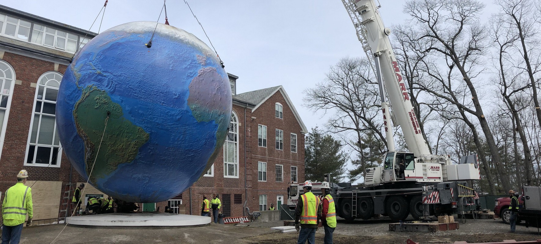 Located on the Babson College campus, the 28-foot-diameter, 25-ton Babson College Globe was originally engineered to rotate on its own axis. The operating machinery rotates the globe about the trunnion and rotates the trunnion and support structure to simulate the movement of the Earth as it orbits the sun. At the time of WJE's mechanical inspection, the historic heavy movable structure was undergoing a yearlong donor-funded restoration.