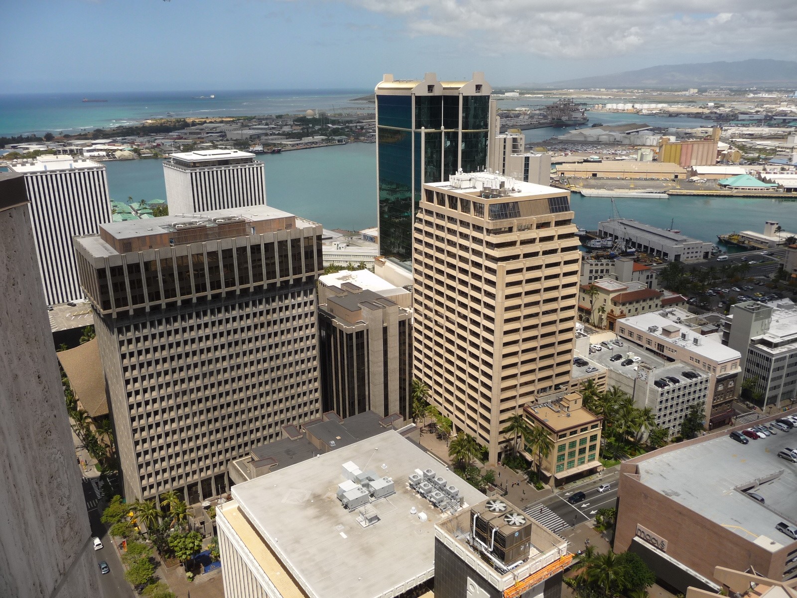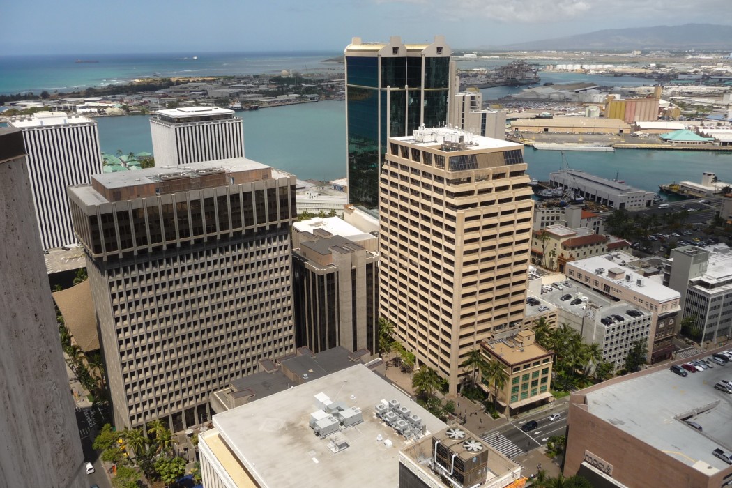 The site consists of a below- and above-grade parking structure and two commercial high rise buildings. The 30-story American Savings Tower was constructed circa 1972 and is clad with exposed, pre-cast, horizontally orientated ribbed concrete spandrel panels with cast-in decorative designs and ribbon window openings spanning the column bays. The 28-story Pauahi Tower, constructed circa 1983, is clad with travertine stone on precast concrete panels and a bronze anodized aluminum curtain wall with bronze-tinted vision glass and spandrel panels. The above-grade parking structure is constructed similar to the ASB Tower with precast and cast-in-place, decorative exposed aggregate finishes.