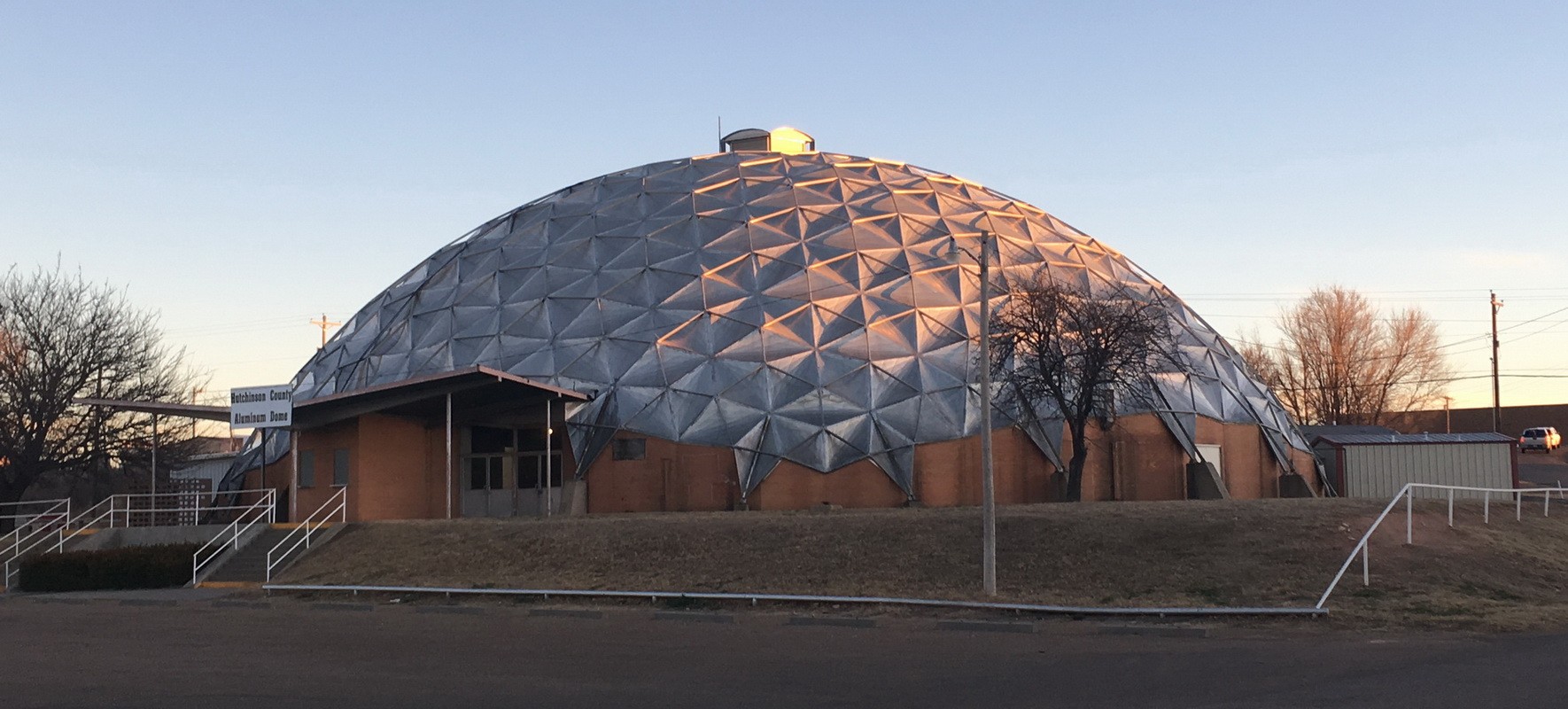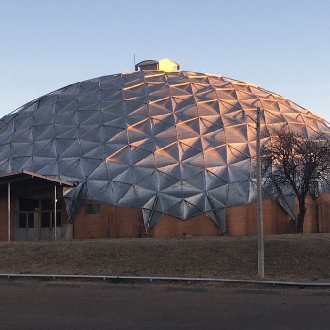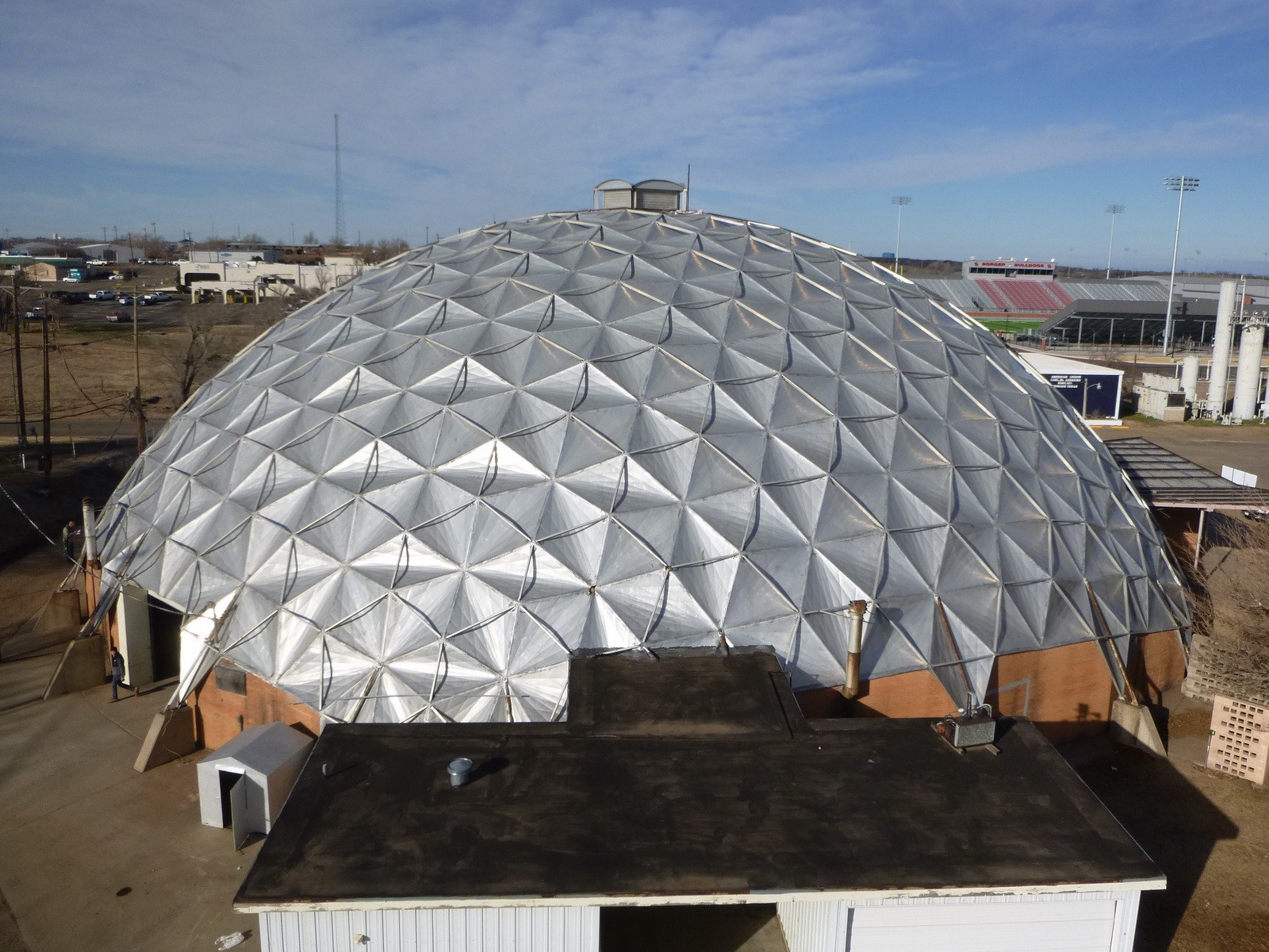 The Borger Dome is a geodesic Kaiser dome originally constructed in the late 1950s. Since opening, the dome has served as a venue for many community events. The circular main portion of the building encloses an area of approximately 16,500 square feet, spanning over an interior diameter of approximately 145 feet. The exterior “apron” walls at the base of the dome are composed of brick masonry veneer over concrete masonry unit (CMU) backup. The domed roof is composed of segmented aluminum panels supported by exterior tube struts and perimeter concrete buttresses. At the center of the dome, the roof is approximately fifty feet high. The dome had reportedly experienced ongoing water infiltration issues throughout its service life.