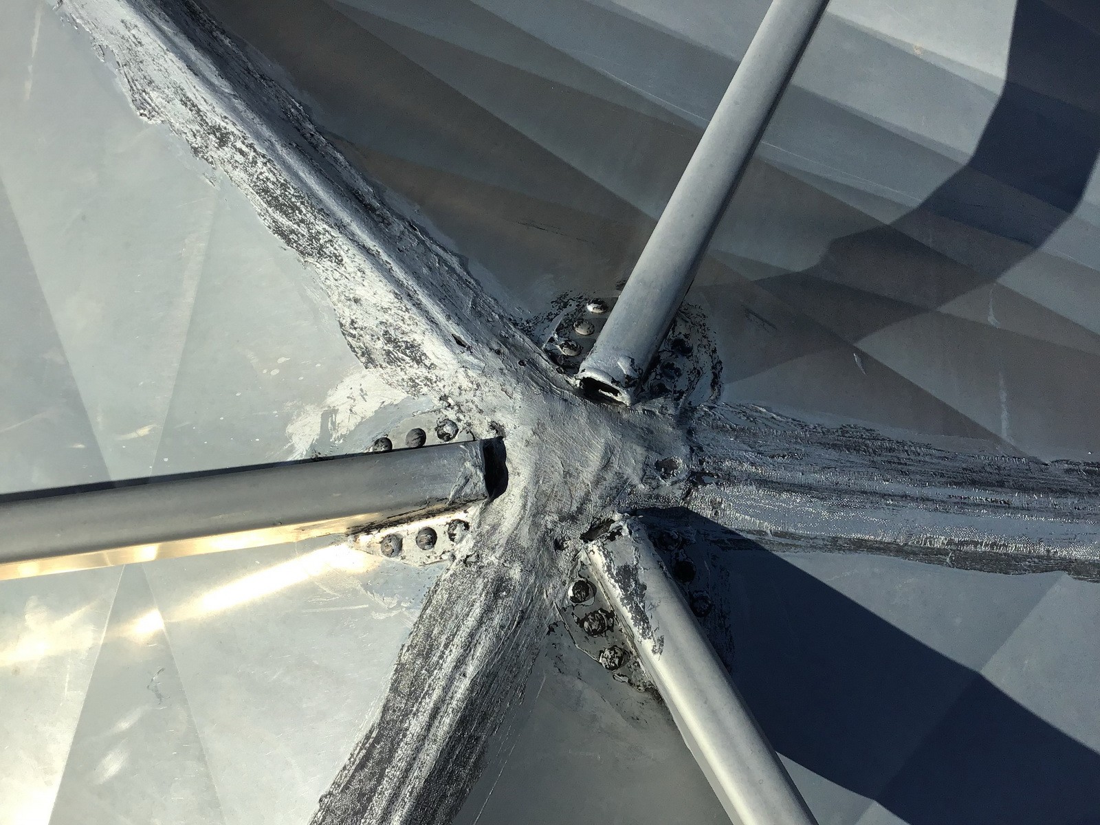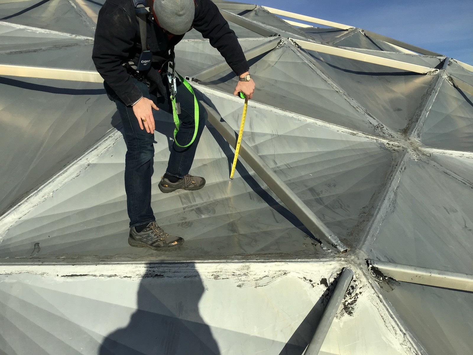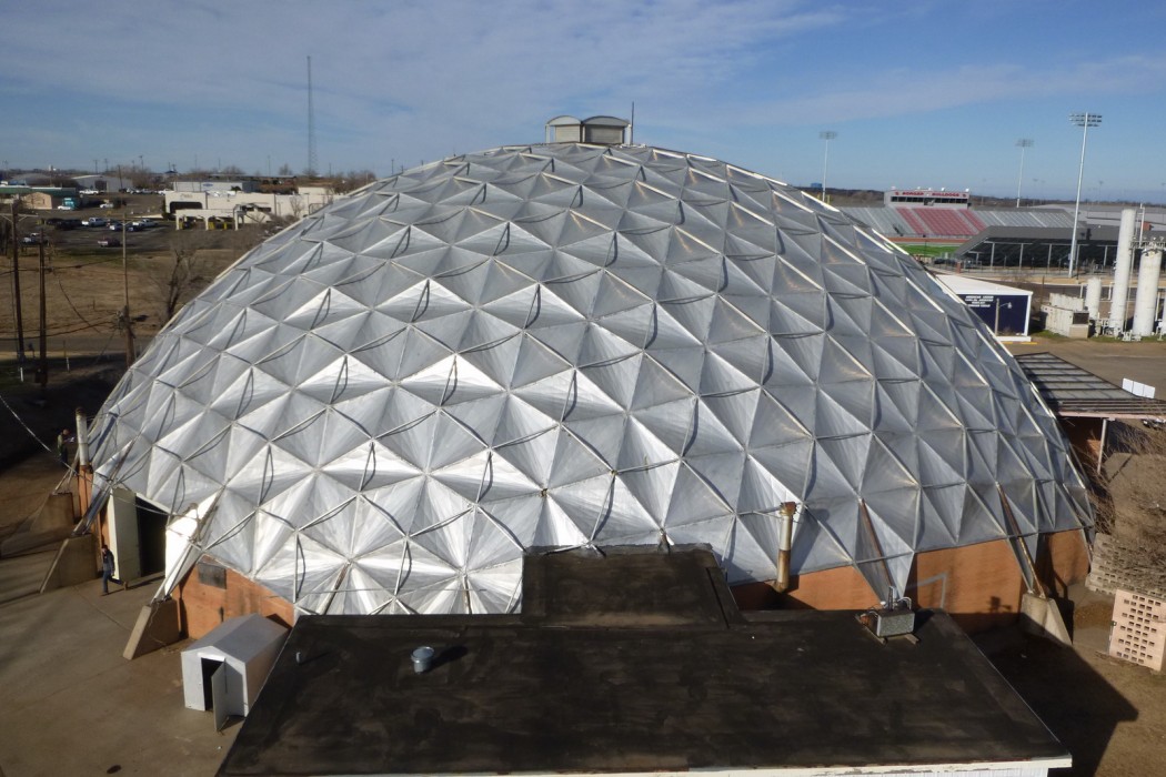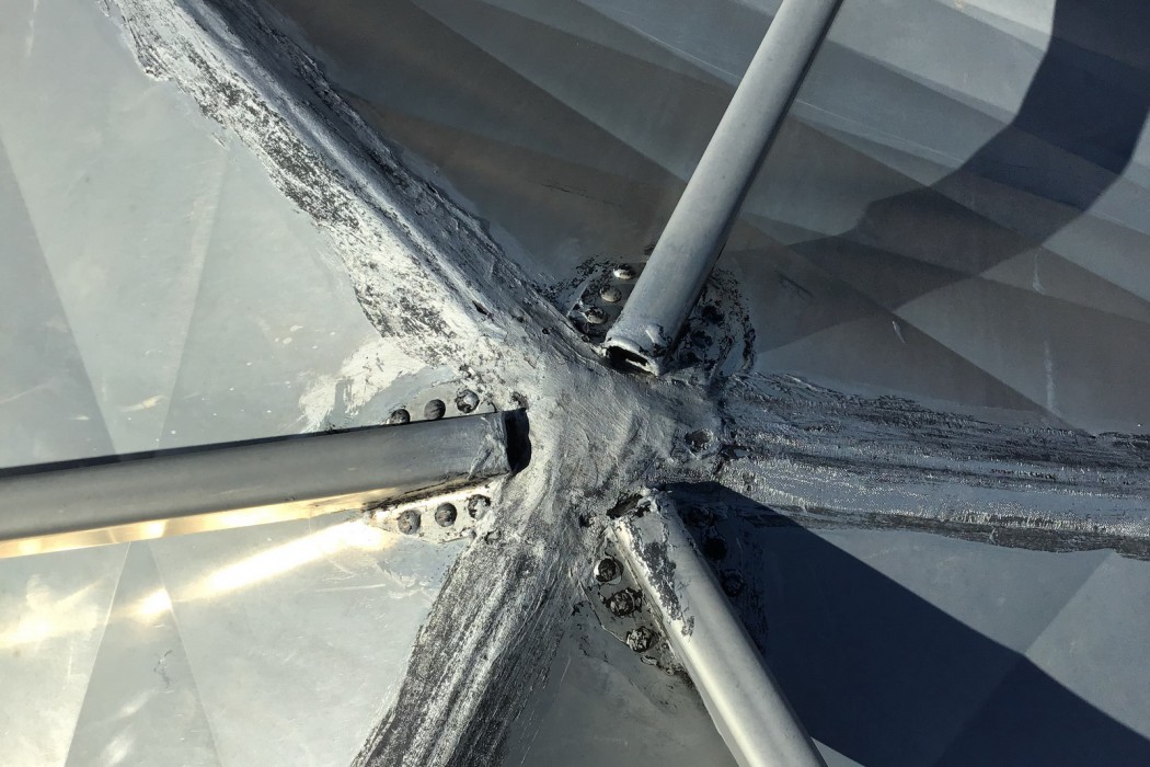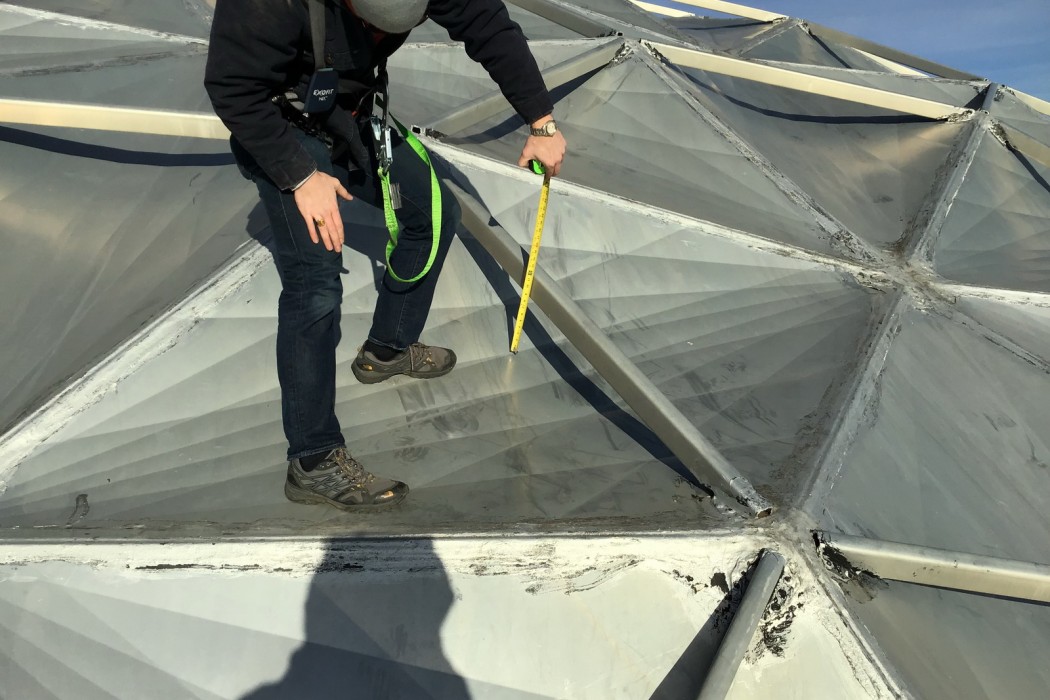 WJE performed a field survey of the Borger Dome to document the condition and as-built configuration of the structural and waterproofing systems. In addition, general sizes, layout, and typical details of the dome were documented for additional analysis. Investigative openings were also created to better understand the configuration of the aluminum panel joints and exterior strut connections. WJE prepared a report for the client that included observations, conclusions, and recommendations for both the structural system and waterproofing system.