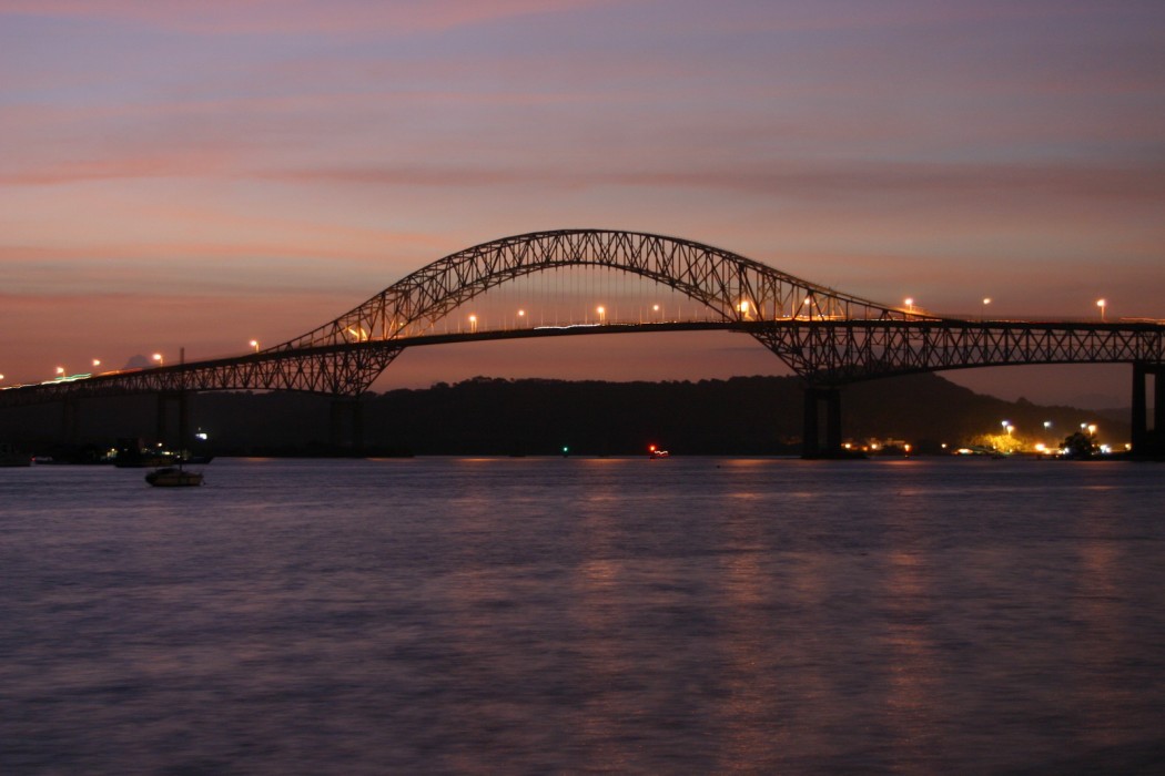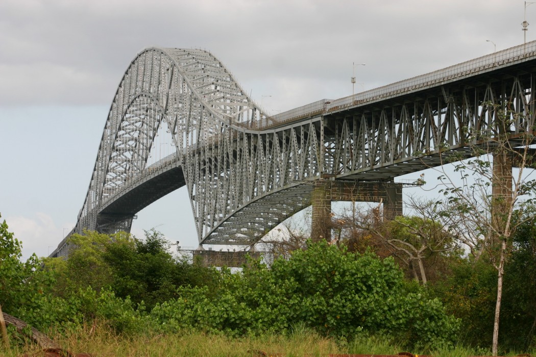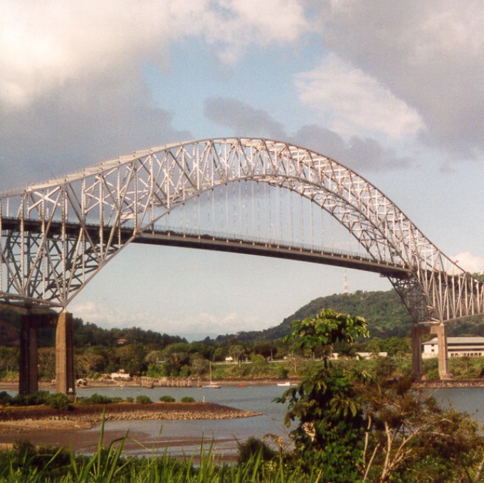 The Bridge of the Americas, completed in 1962, is a riveted tied-arch bridge that runs east to west and spans a mile and a half over the Panama Canal, where it opens into the Bay of Panama in the Pacific Ocean.