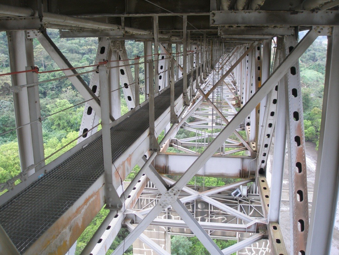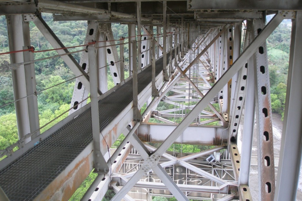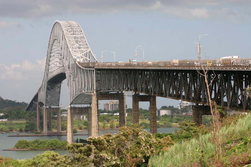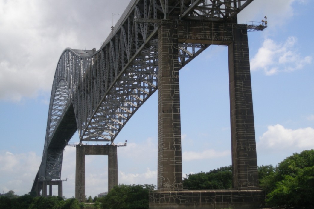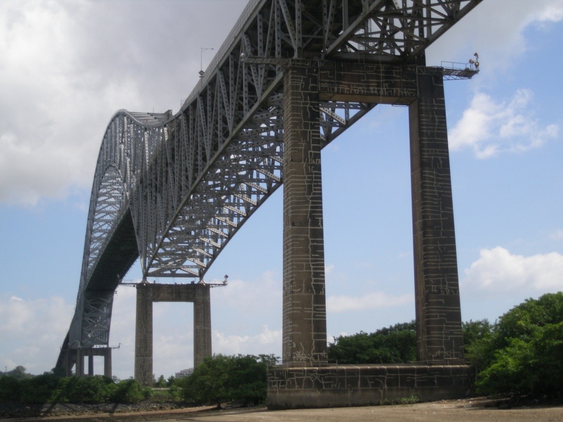 The Bridge of the Americas connects the Americas across the Panama Canal on International Highway 1. Completed in 1962, the 5,427-foot-long bridge features two approach spans and a central tied-arch span over the main canal waterway. It is supported on thirteen concrete piers and end abutments. The steel superstructure consists of two parallel, long-span trusses 42 to 139 feet in height. A nominal 7-inch-thick and 58-foot-wide concrete deck is supported on longitudinal stringers that, in turn, bear on floor beams. Suspended sections of the steel truss system are connected at six locations with a total of twenty-four steel transfer pins ranging in diameter from 9 to 19-5/8 inches.