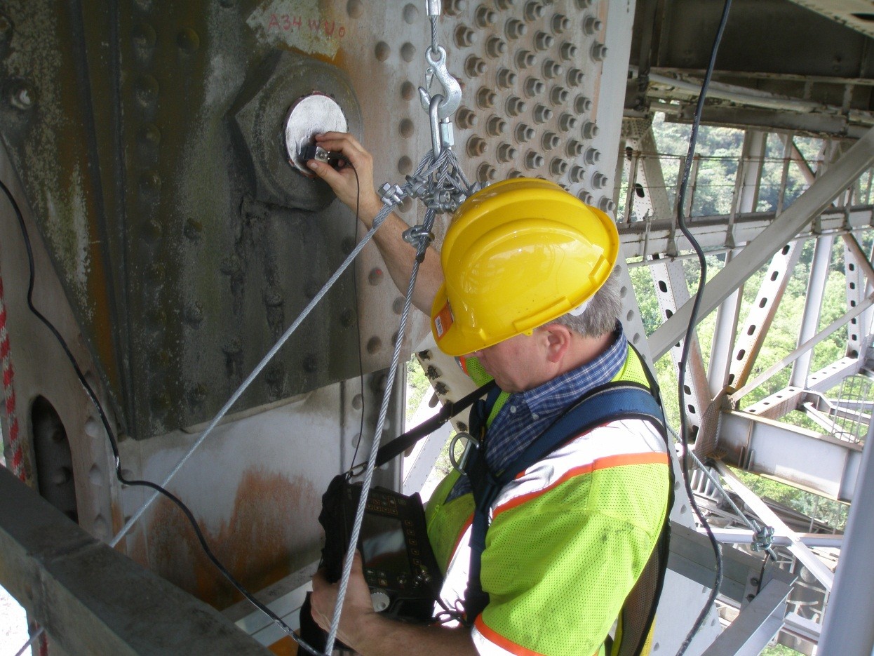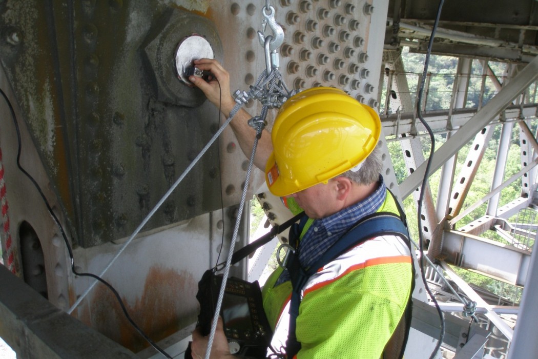 WJE bridge engineers performed the visual inspection of the steel superstructure and reinforced concrete piers using industrial rope access techniques (climbing, rappelling, and ascending). Fracture-critical members and their connections were visually inspected at arm's length for evidence of cracking, corrosion, and other indications of distress. The piers were sounded for delaminations. An assessment of the transfer pins included visual observation of pin surfaces and comprehensive nondestructive ultrasonic examination of inaccessible internal pin-hanger assemblies.