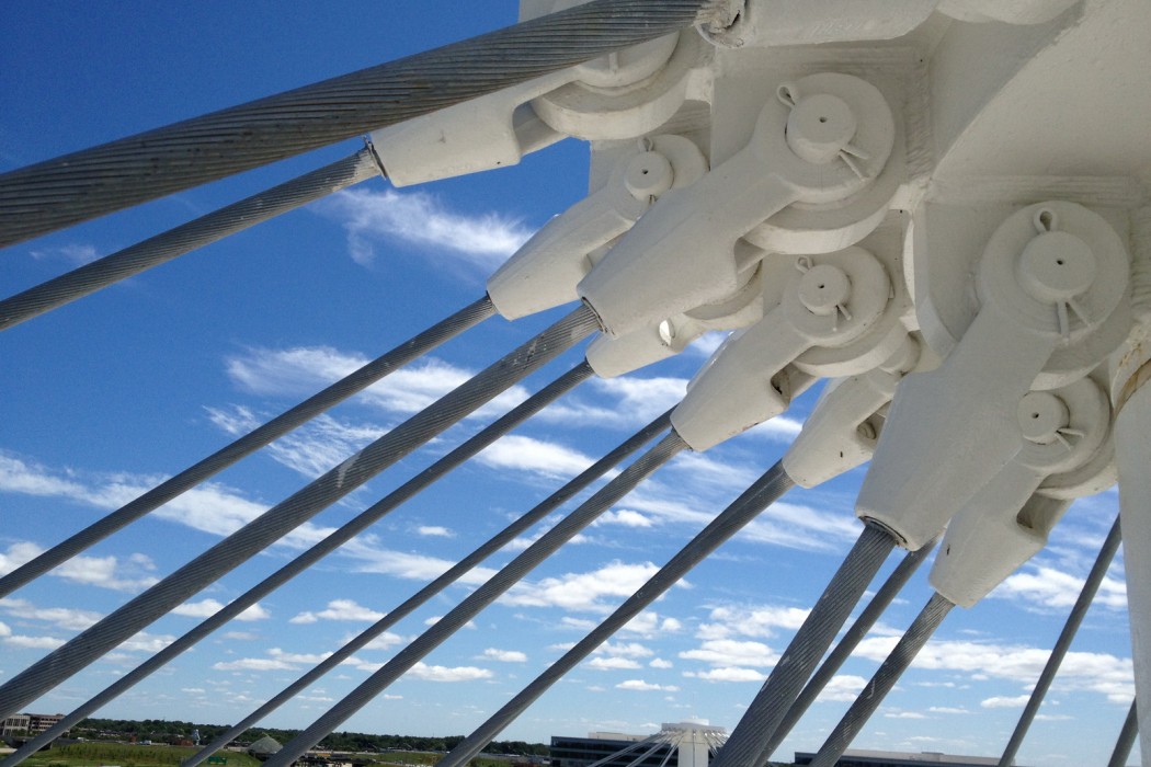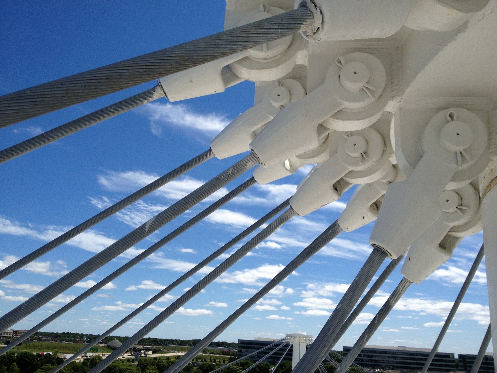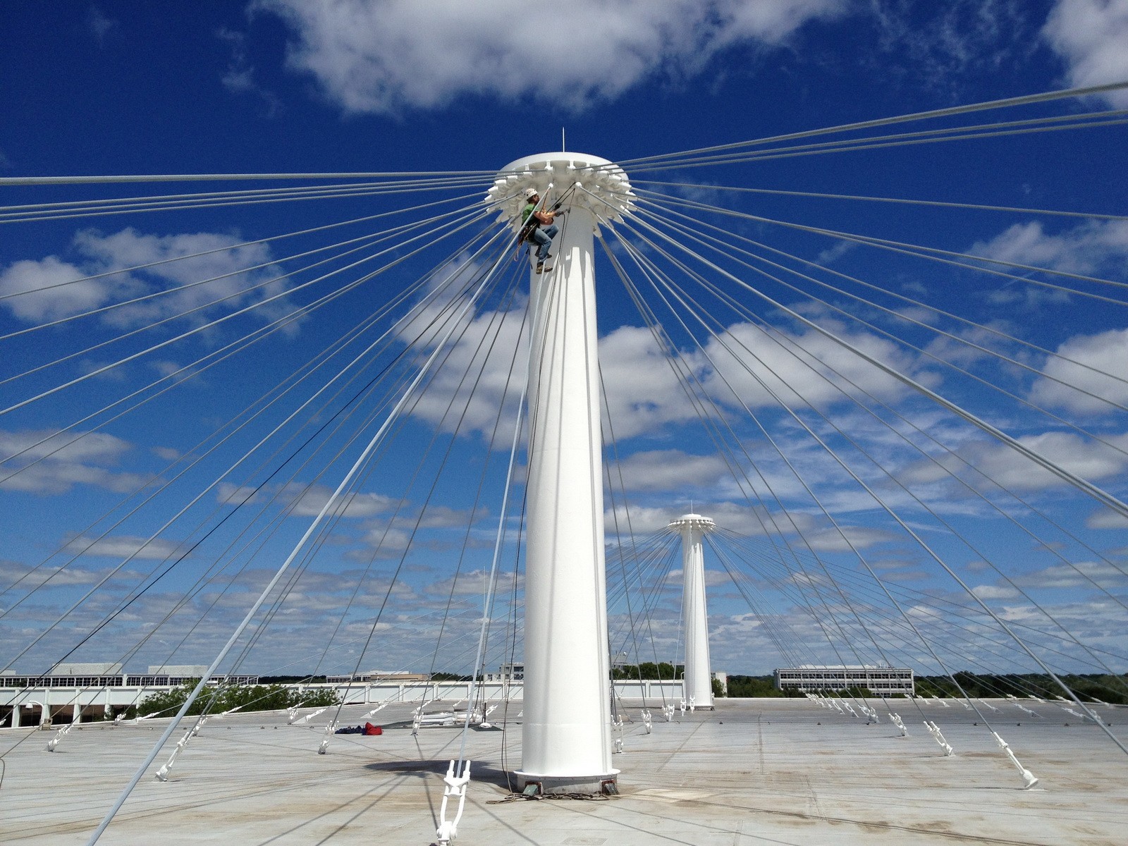 The level of corrosion did not pose a structural concern. However, since these cables serve as the primary structural support for the roof, WJE recommended a more frequent inspection cycle to establish the rate of progression of the corrosion on the cables. To avoid the expense of constructing scaffolding around the cables to facilitate access for inspections, WJE was retained to utilize industrial rope access techniques to access the tops of the masts and to inspect the lengths of the cables and their anchorages. Climbing, rappelling, and ascending were utilized to provide arms-length inspection of the cable anchorages at the tops of the masts as well as at an assortment of cables during each inspection.
