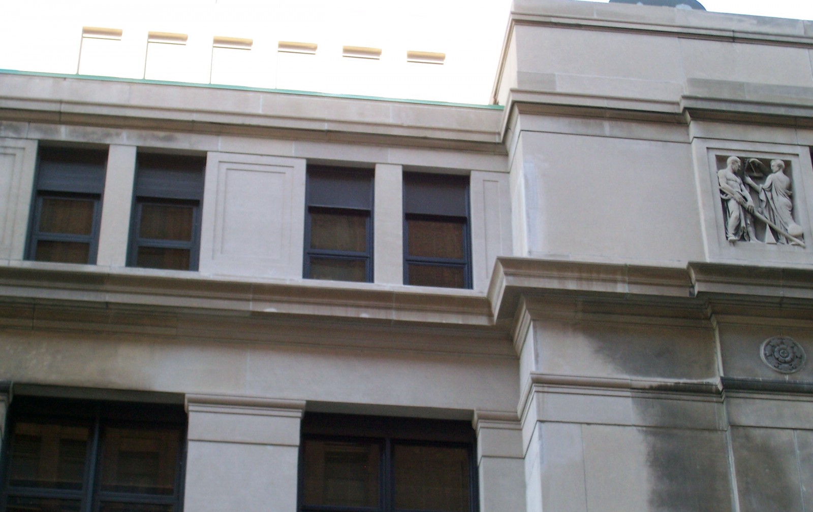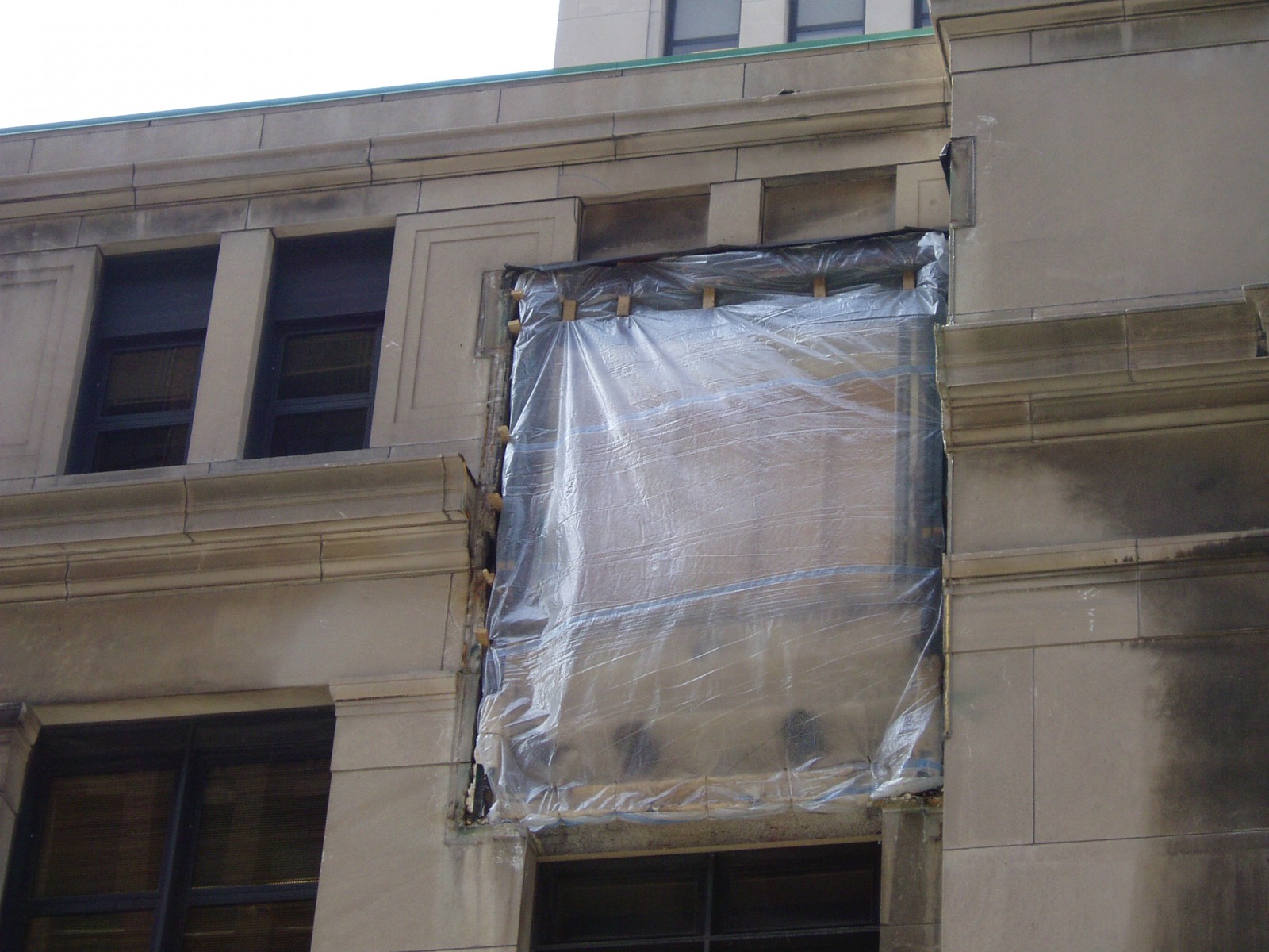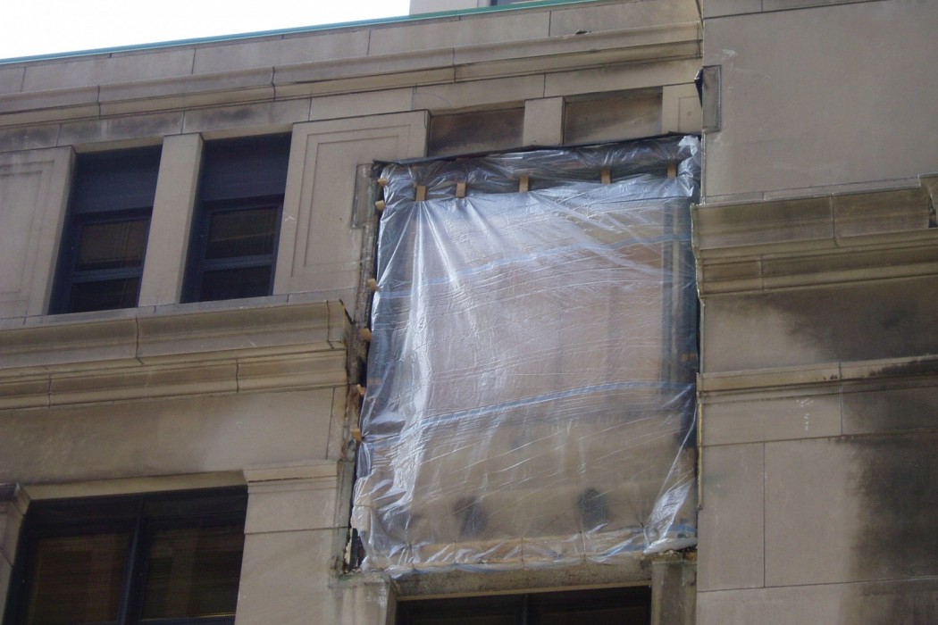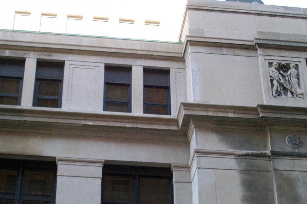Because detailed drawings of the existing structural system, limestone profile intricacies, and custom window fabrication were unavailable, WJE personnel performed a close-up aerial lift field investigation to document the existing conditions and prepare the repair drawings. WJE's team proposed a fast-track project delivery method to expedite and reduce the cost of design while allowing the contractor an opportunity to suggest cost saving methods. Drawings and specifications were developed to identify the scope of the repair, including structural steel replacement, limestone and custom window detailing, joint sealants, and associated interior construction. WJE developed bid analyses, which aided the owner in contractor selection, and performed construction period services, including submittal review, hands-on inspections, and routine site visits. WJE also prepared as-built drawings to document the final installation of the repairs.