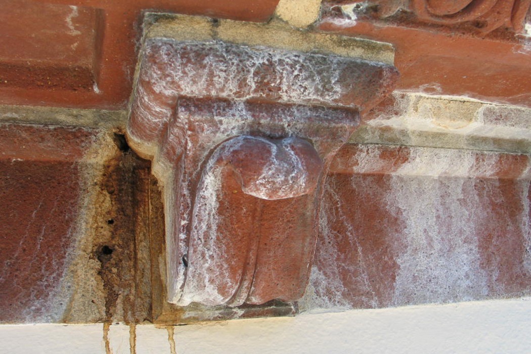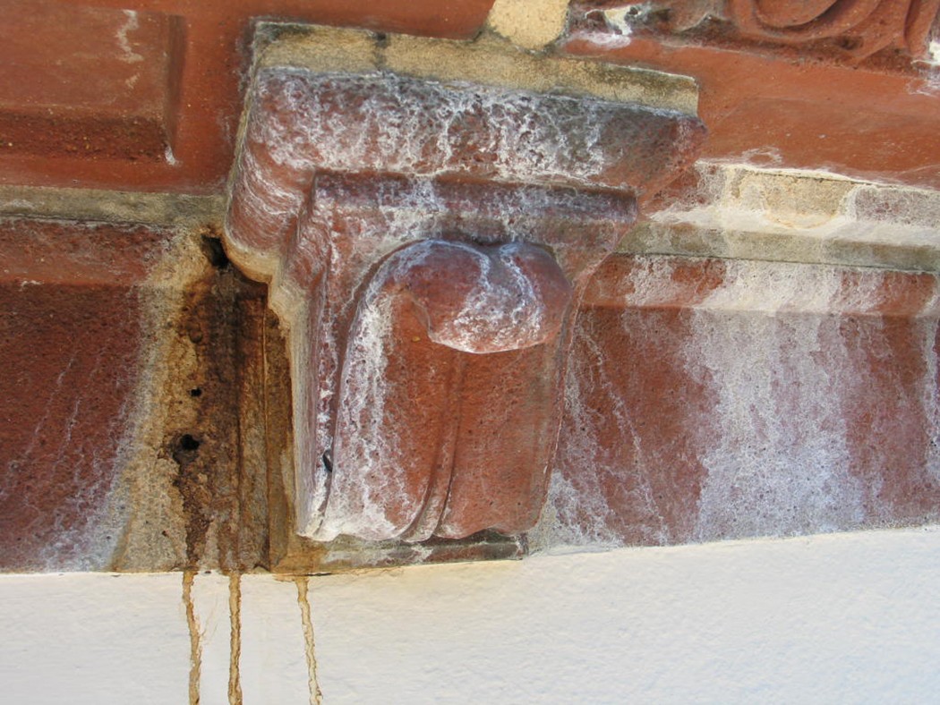 The houses were in a state of disrepair with significant deterioration in the clay tile roofing and decorative facade elements, including the window and door surrounds and arches.