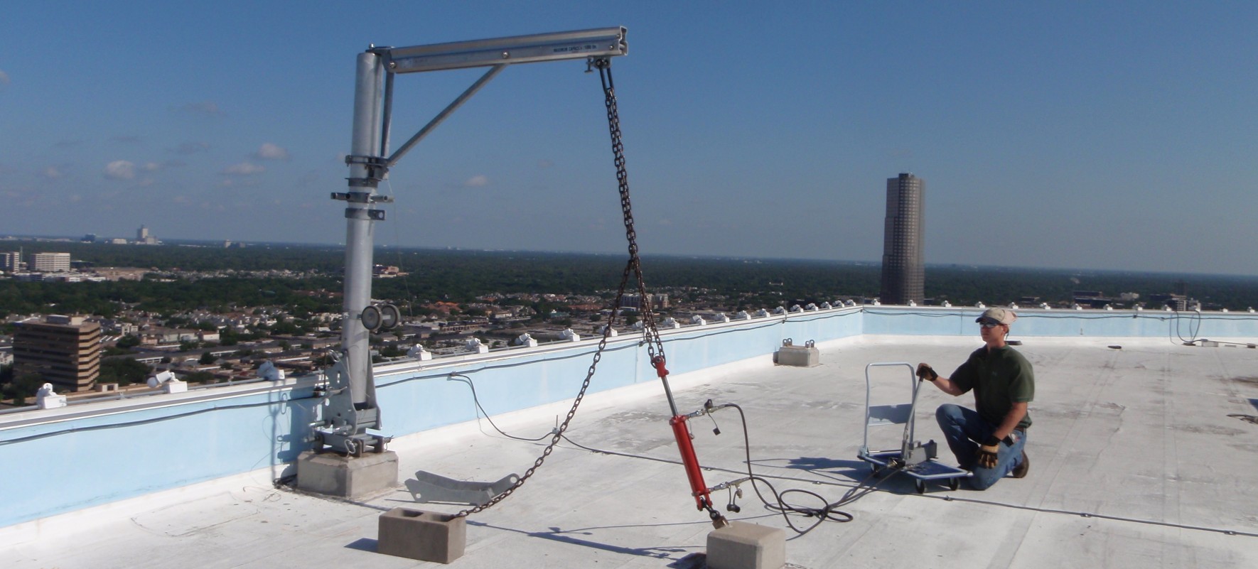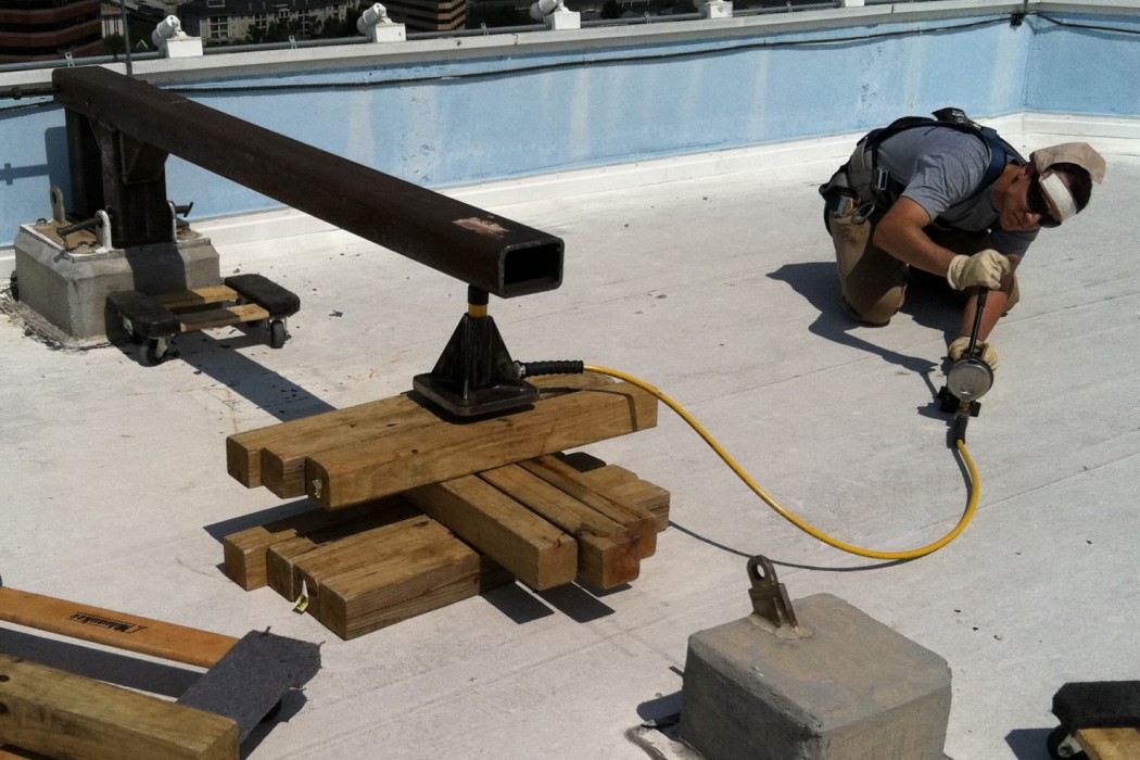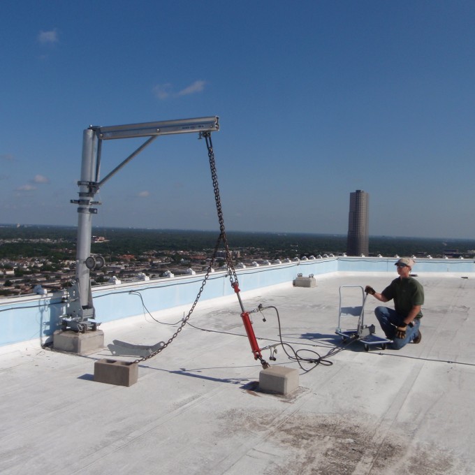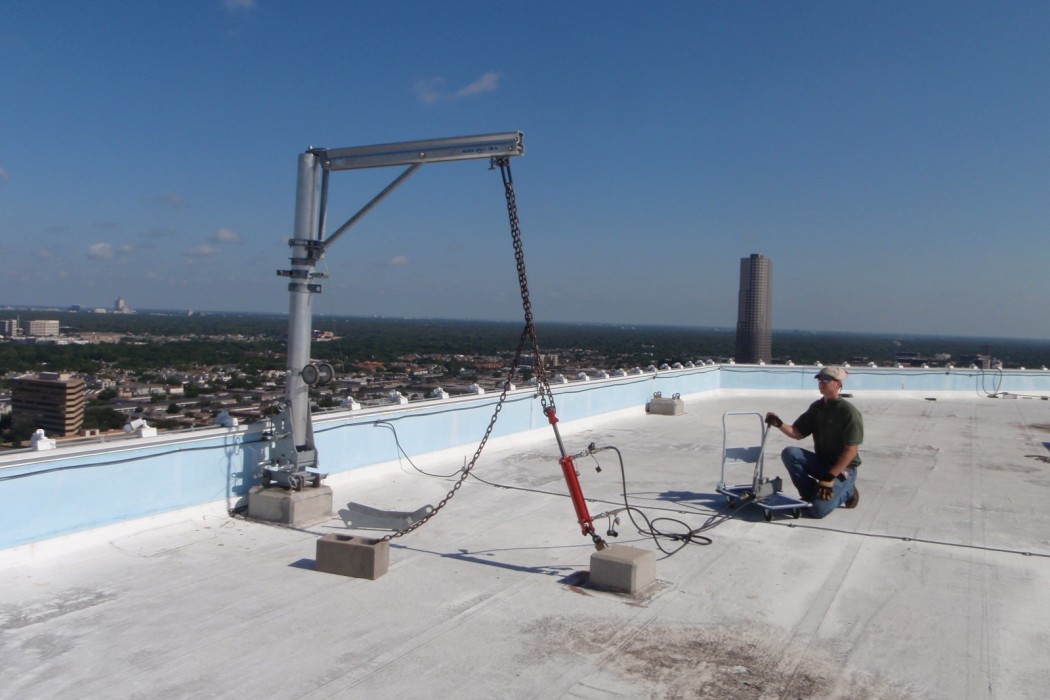 WJE's evaluation included reviewing tests performed by other firms to determine what additional measures would be necessary to ensure that the davit system would comply with OSHA's minimum requirements. Based on reviews, WJE concluded that the testing protocol suggested by the other firms would not be adequate to conform to OSHA's minimum requirements. WJE performed testing of all davits, davit bases, and fall arrest anchors using several testing apparatus and configurations to overcome complicated field conditions and minimize disruption to the office tenants.