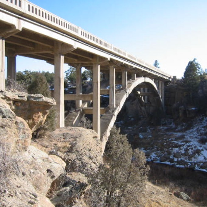 Built in 1948, the Castlewood Canyon Bridge spans 232 feet across Cherry Creek near Franktown, Colorado. It features two 46-foot-deep concrete arches that span between concrete column piers and support a 35-foot-wide deck. It was once called the "bridge to nowhere" because, for nearly twenty years after it was built, the south end of the bridge was also the end of State Highway 83. Today, the bridge is considered a historic structure because of its distinctive arch design and its dramatic setting within Castlewood Canyon State Park.
