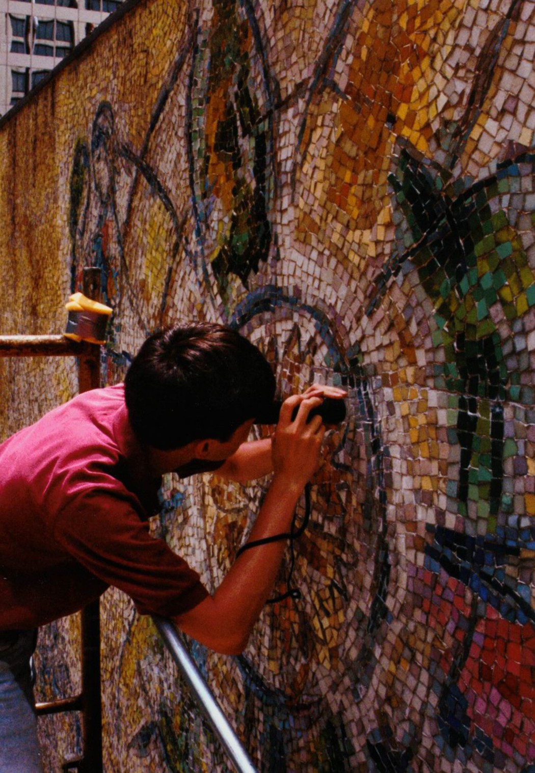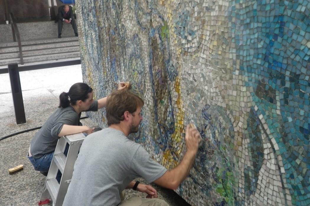 WJE removed the graffiti and cleaned the mosaic with a neutral pH, nonionic surfactant. Missing or damaged tesserae was replaced with new tesserae selected to best match the original shape and color. Where the bird deterrent system had detached from the granite copings, the posts were reattached with an adhesive.
