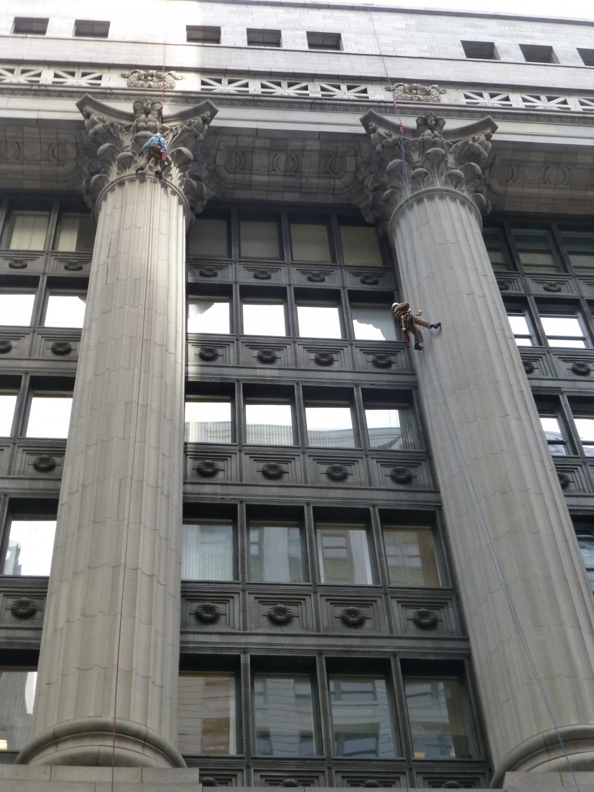 The Chicago City Hall/Cook County building was designed by Holabird & Roche and was completed in 1911. Overall dimensions of the entire building are 373 feet in both the north-south and east-west directions. The west half of the building is occupied by the City of Chicago and the east half by Cook County. The eleven-story building rises to a height of 200 feet above the street level. The exterior street facade of the building is a classic Greek Revival-style and consists of granite and terra cotta with wood frame windows. The granite is located on the lower three floors and on the columns that extend from the fourth to the ninth floor.