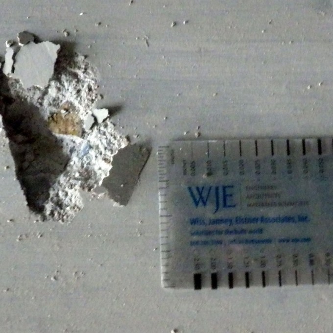 During preparations for the original tenant finish out, concrete slab surface distress was noted by the owner. This distress included localized delamination, spalling, and pop-outs at thousands of locations associated with white deposits and exudations from within the concrete. WJE was retained to investigate the reported slab distress, determine if the condition was ongoing and likely to continue, and provide recommendations for repair.