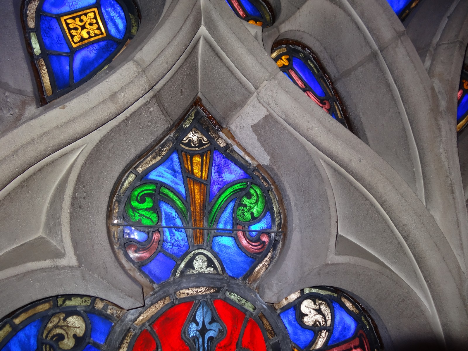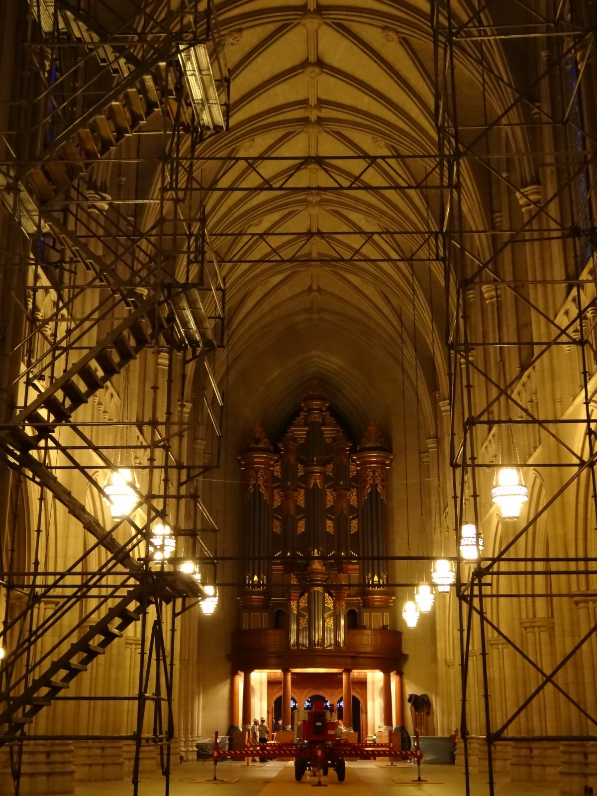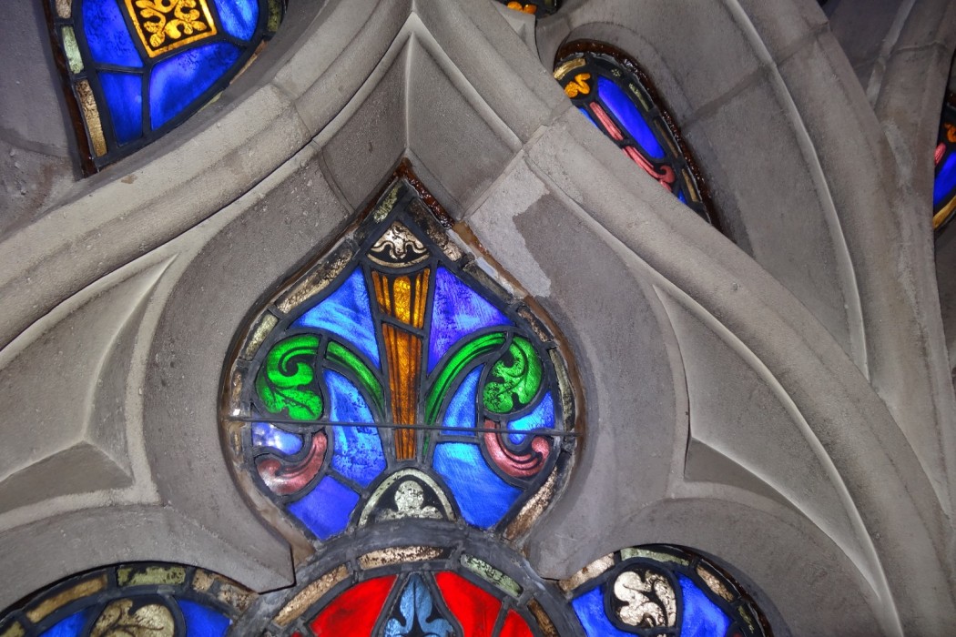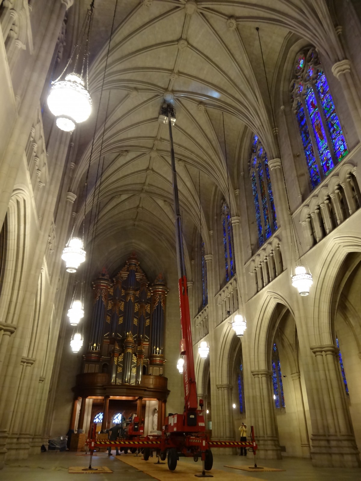 Duke University Chapel, the ecumenical center for religion on campus, was designed in the late 1920s by Julian Abele of the Philadelphia firm of Horace Trumbauer. The vaulted ceiling system is comprised of a series of stone ribs that form a series of vaulted framing bays centered on the stained glass windows in the exterior walls of the chapel. Between the stone ribs is a Guastavino vaulted ceiling system that is supported on the stone ribs. The stone ribs are comprised of carved stone pieces with a mortar joint between each piece and circular keystones located at the crown of each vault, between adjacent vaults, and at each window.