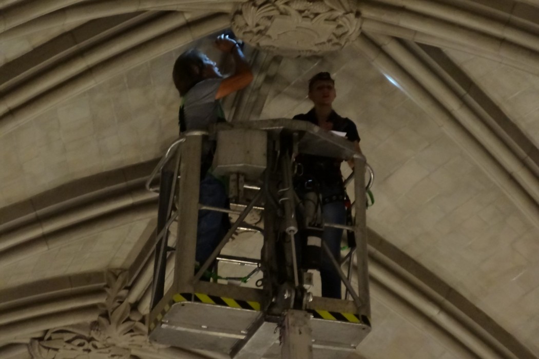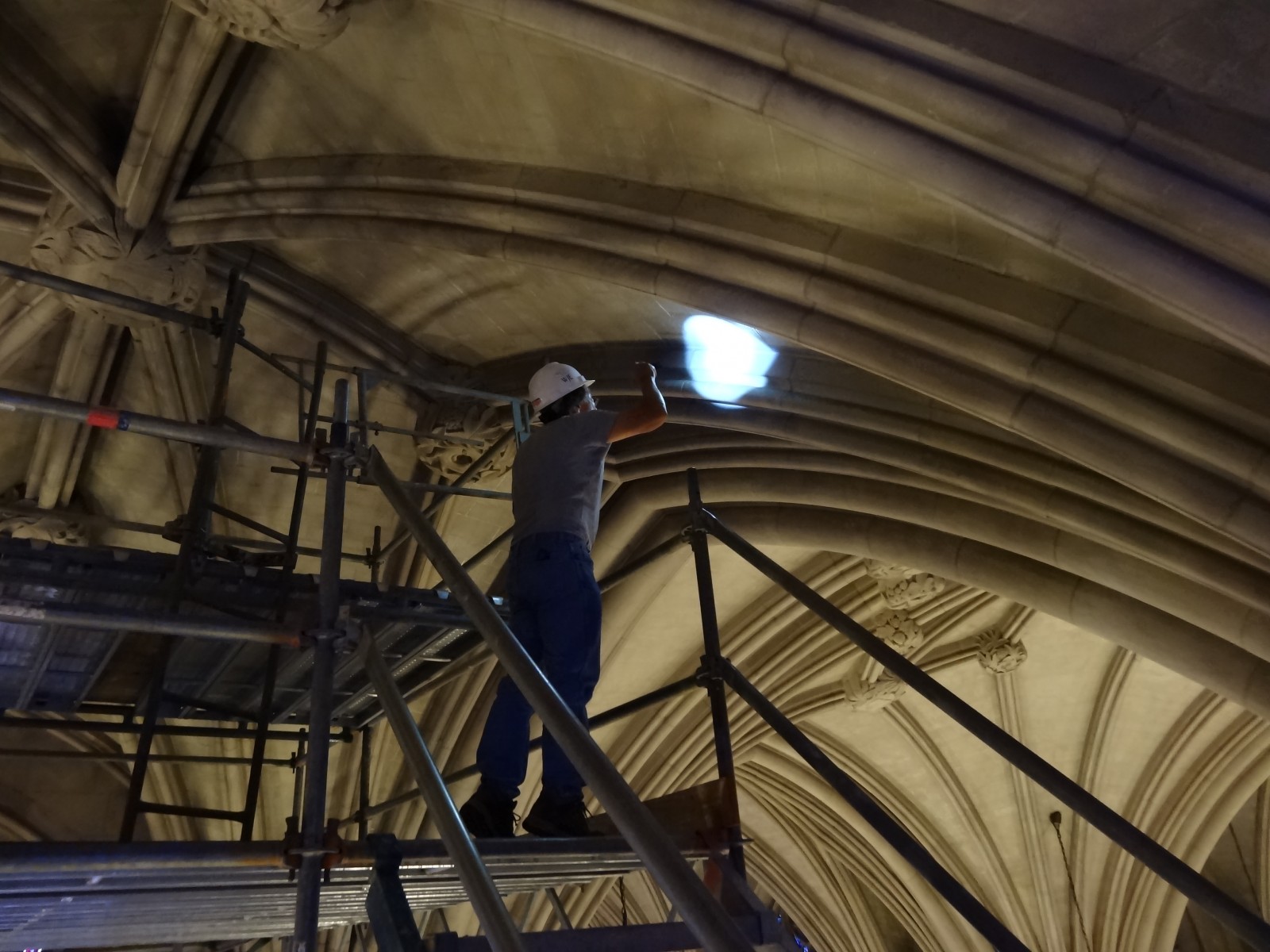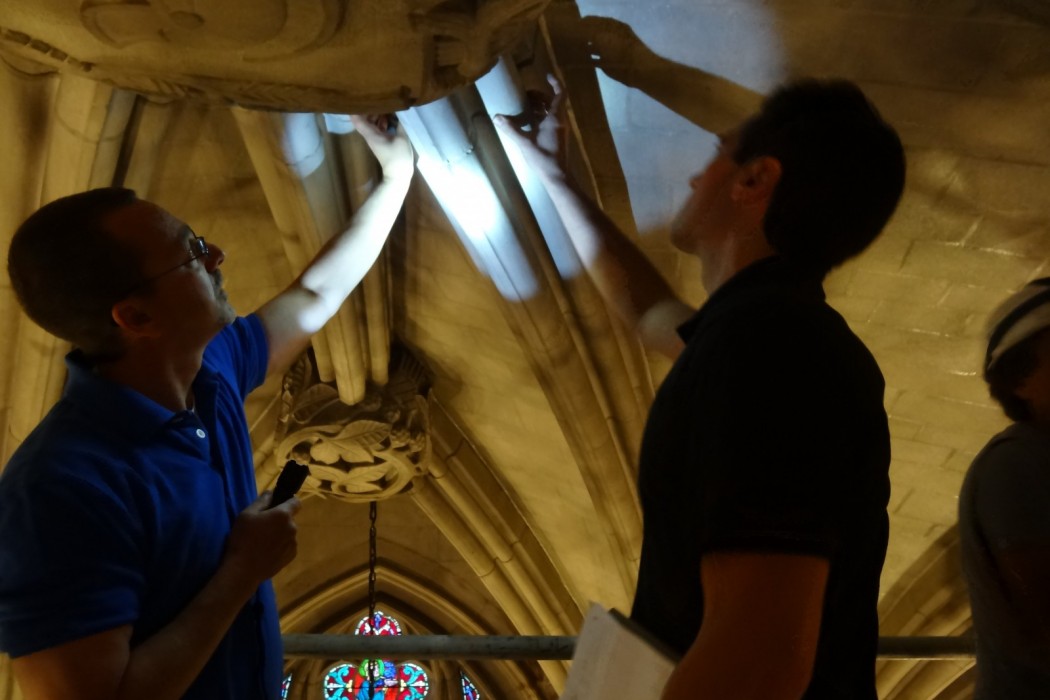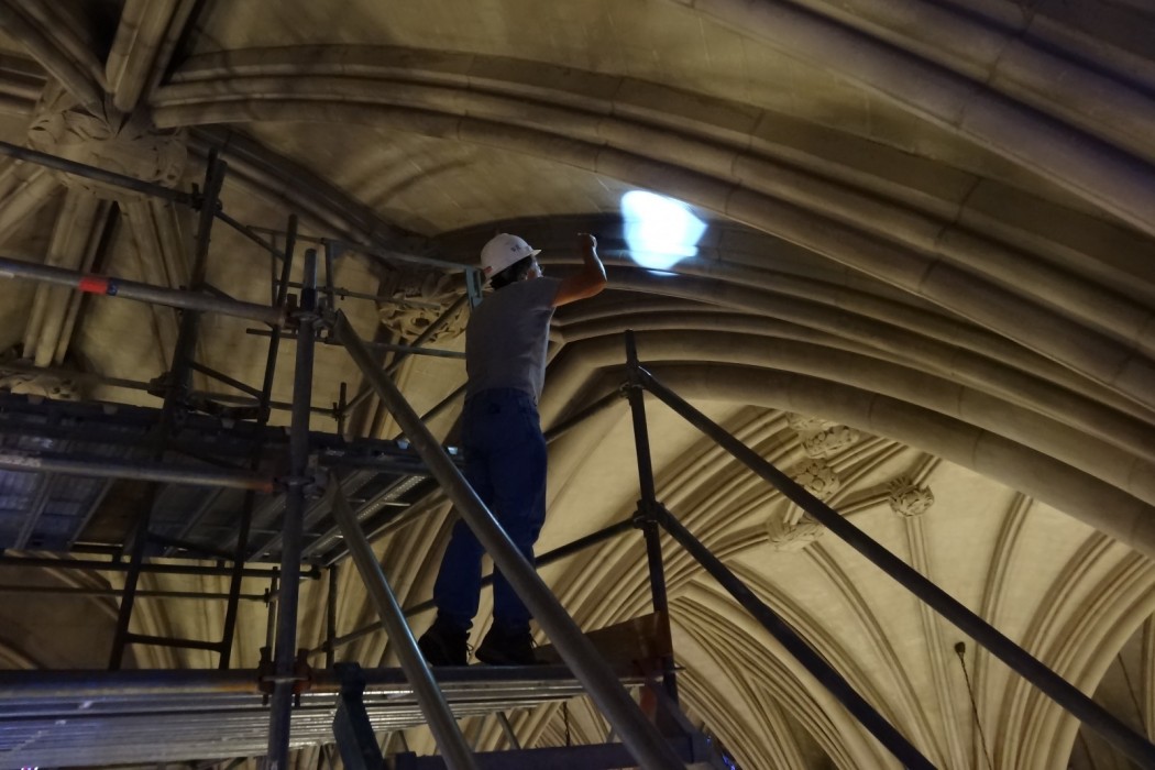 In the summer of 2012, a stone fragment from one of the stone ribs was discovered on the floor of the nave. The University erected scaffolding in the bay where the stone fragment was discovered and contacted WJE to perform an initial inspection of the vaulted ceiling system. Following the initial inspection, a close-up visual inspection was performed from lifts.