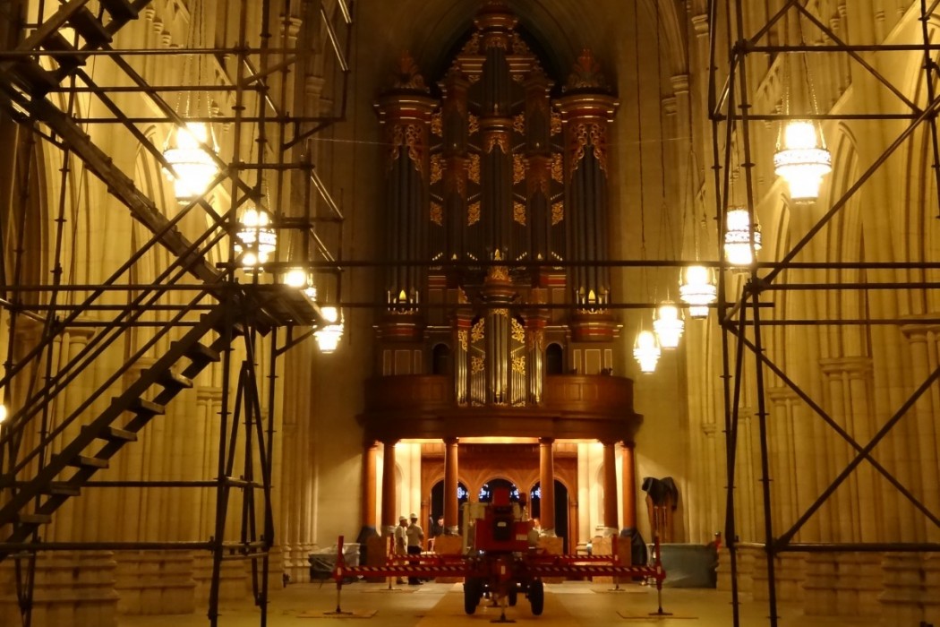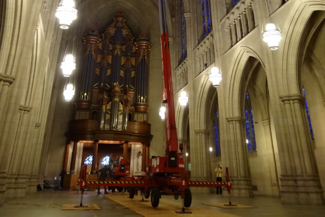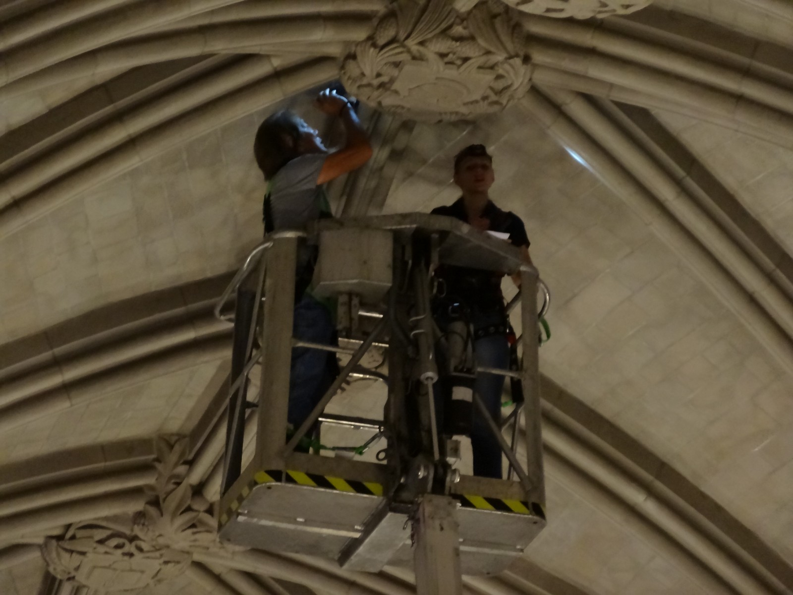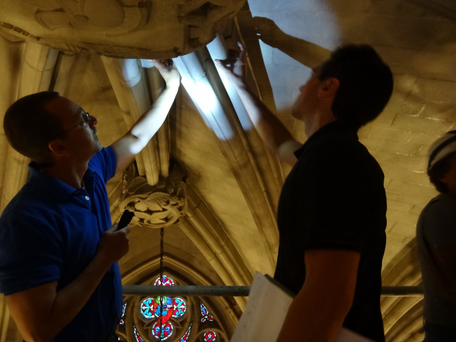 In the summer of 2012, a stone fragment from one of the stone ribs was discovered on the floor of the nave. The University erected scaffolding in the bay where the stone fragment was discovered and contacted WJE to perform an initial inspection of the vaulted ceiling system. Following the initial inspection, a close-up visual inspection was performed from lifts.