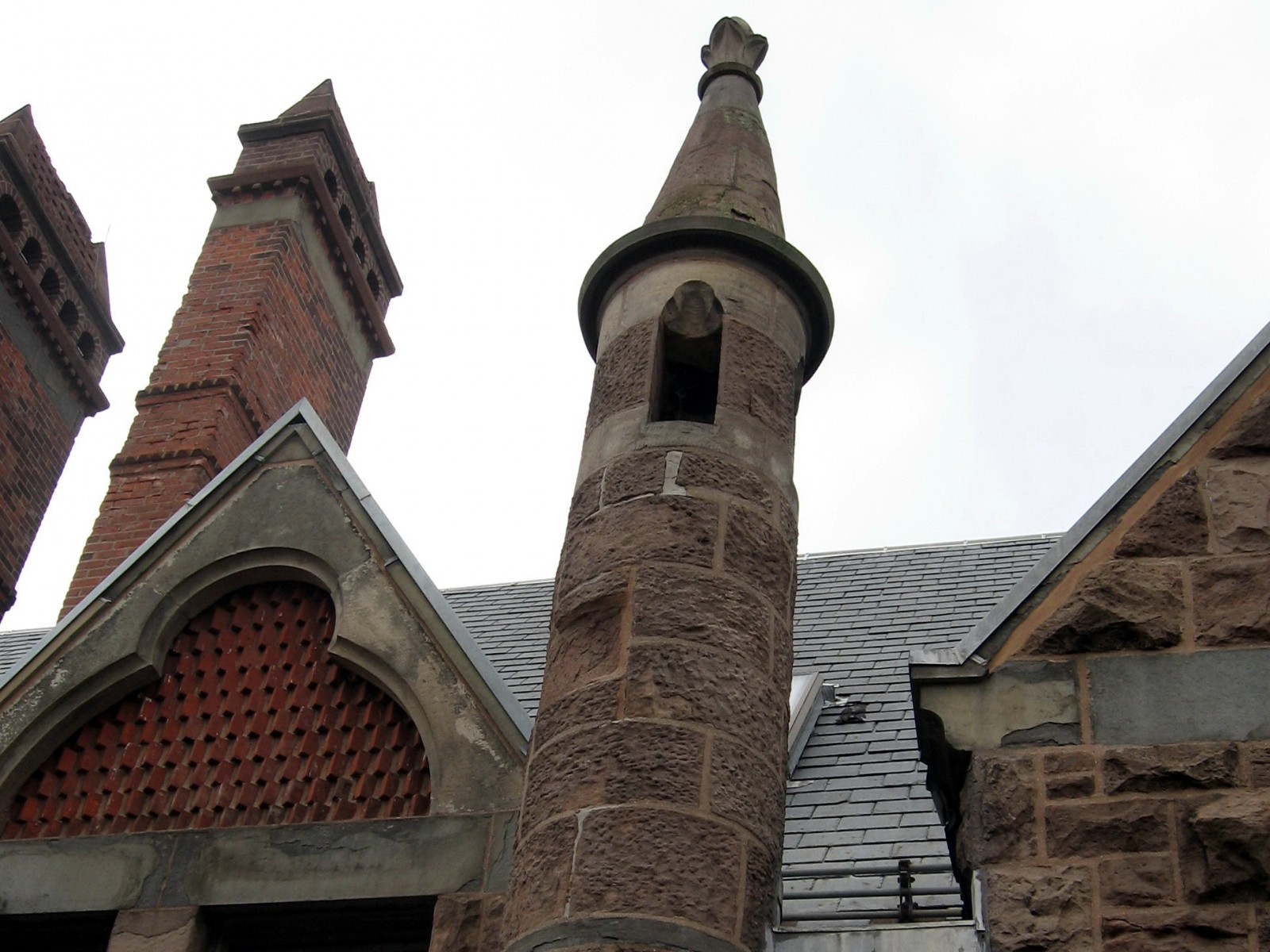 Durfee Hall is the first stone dormitory constructed on the campus of Yale University. When completed in 1871, it was regarded as a high point in Victorian Gothic style architecture. "It will be a long time before the quiet dignity of its roof and chimneys will be surpassed anywhere." wrote American Architect and Building News. The building facades are predominately split face, New Jersey Sandstone. North River Bluestone and buff colored Ohio Sandstone accentuate the facades at the copings, stringcourses, and ornamental trim. Sandstone turrets flank gables located at each end of the building and massive brick chimneys rise above the slate roofing.