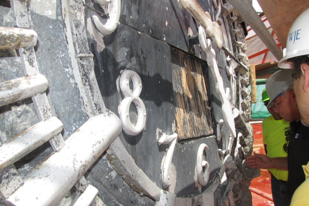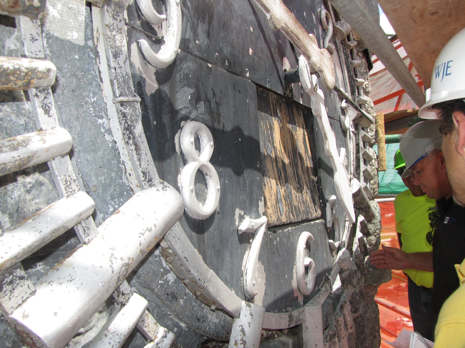 WJE's repairs to the exterior sheet metal cladding included complete removal of existing coatings, in-kind replacement of the copper roofing on the dome, in-kind replacement of significantly deteriorated sheet metal decorative cladding components, supplemental anchorage of the existing sheet metal cladding to remain, patching of deteriorated but salvageable elements with lead sheets molded to the desired shape, epoxy patching of small holes in the metal cladding, and recoating of the tower and dome with a high-performance coating system. The severely deteriorated statue support framing was replaced in-kind, and the bell room floor framing was strengthened. Lady Justice was removed from the building and shipped offsite for complete restoration that included disassembly, removal and replacement of existing coatings, and the installation of a new internal support system. Missing and severely deteriorated components of the statue were replaced.