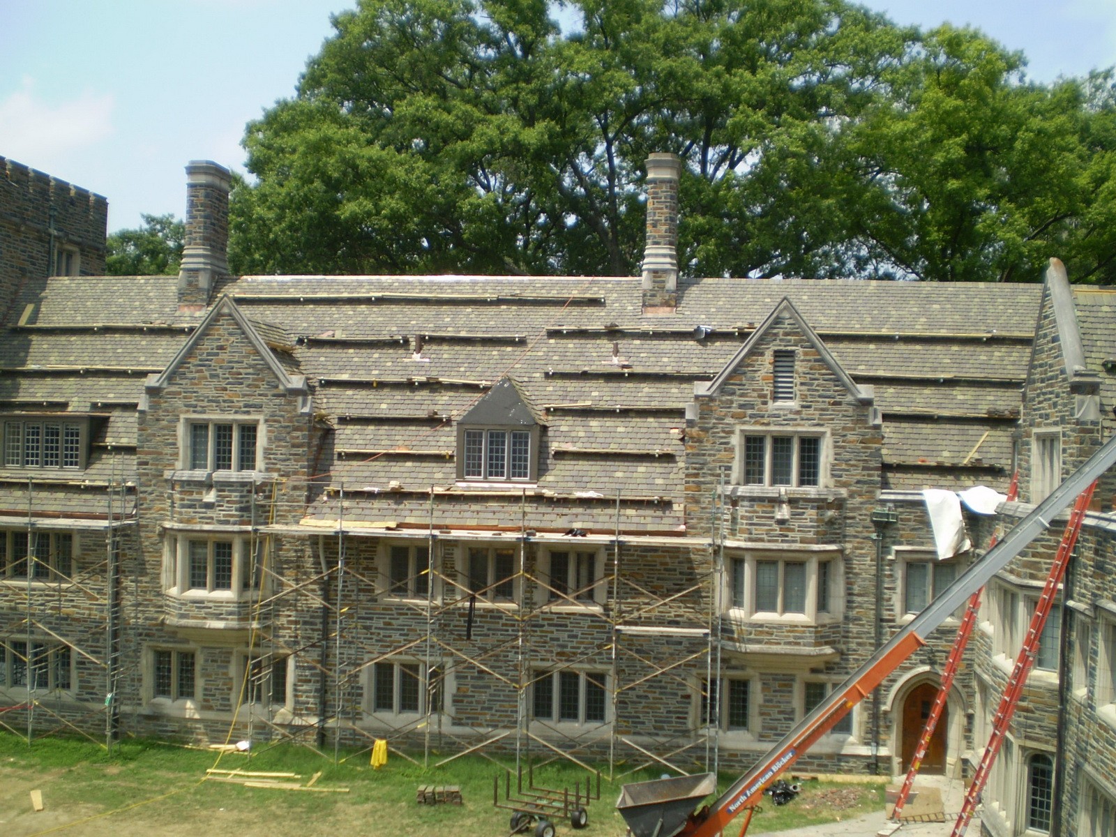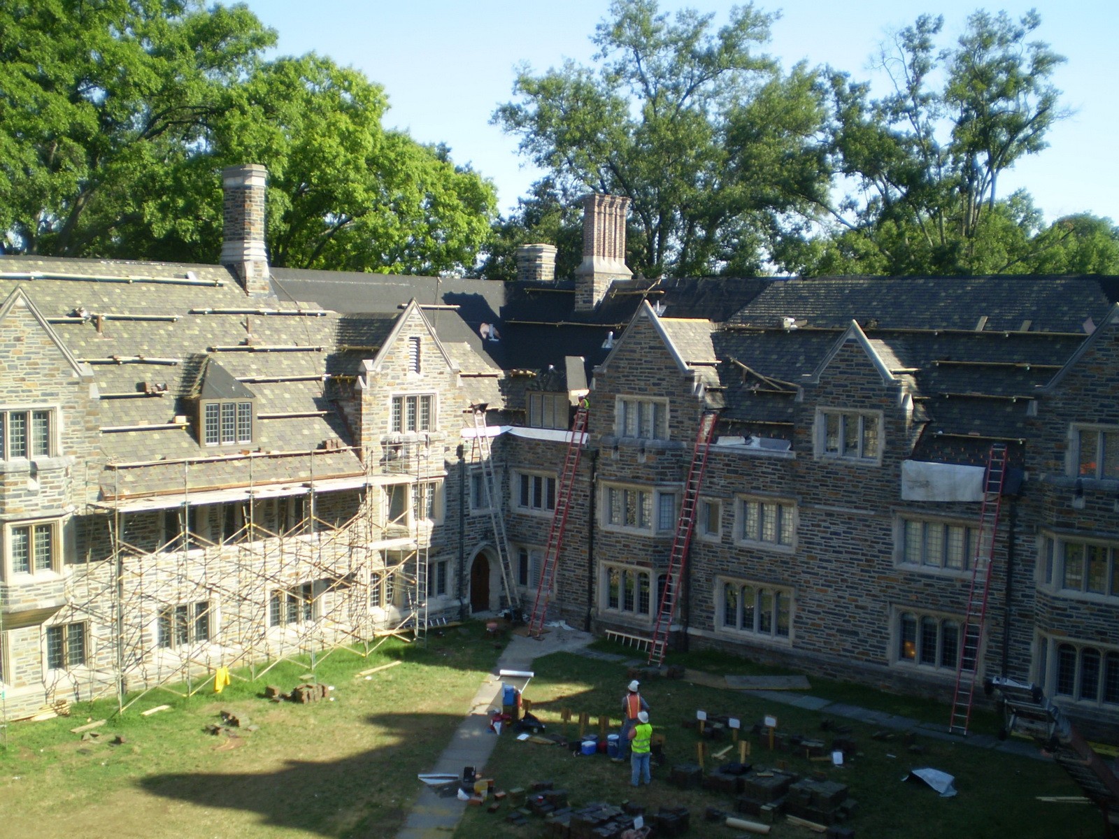 The replacement roof utilized the same historic materials and installation techniques of the original roof to maintain the connection with the past and the rich history of the University. WJE collaborated closely with Duke University and Ludowici to reinstate the discontinued Yale tile shape and to provide a three-color blend to match the aged roofs of adjacent buildings. WJE worked closely with the roofing contractor on-site during construction to ensure proper execution of ridge, valley, gutter, and other termination details, while the contractor diligently sorted construction debris for recycling while protecting the mature landscaping around Few Quad.