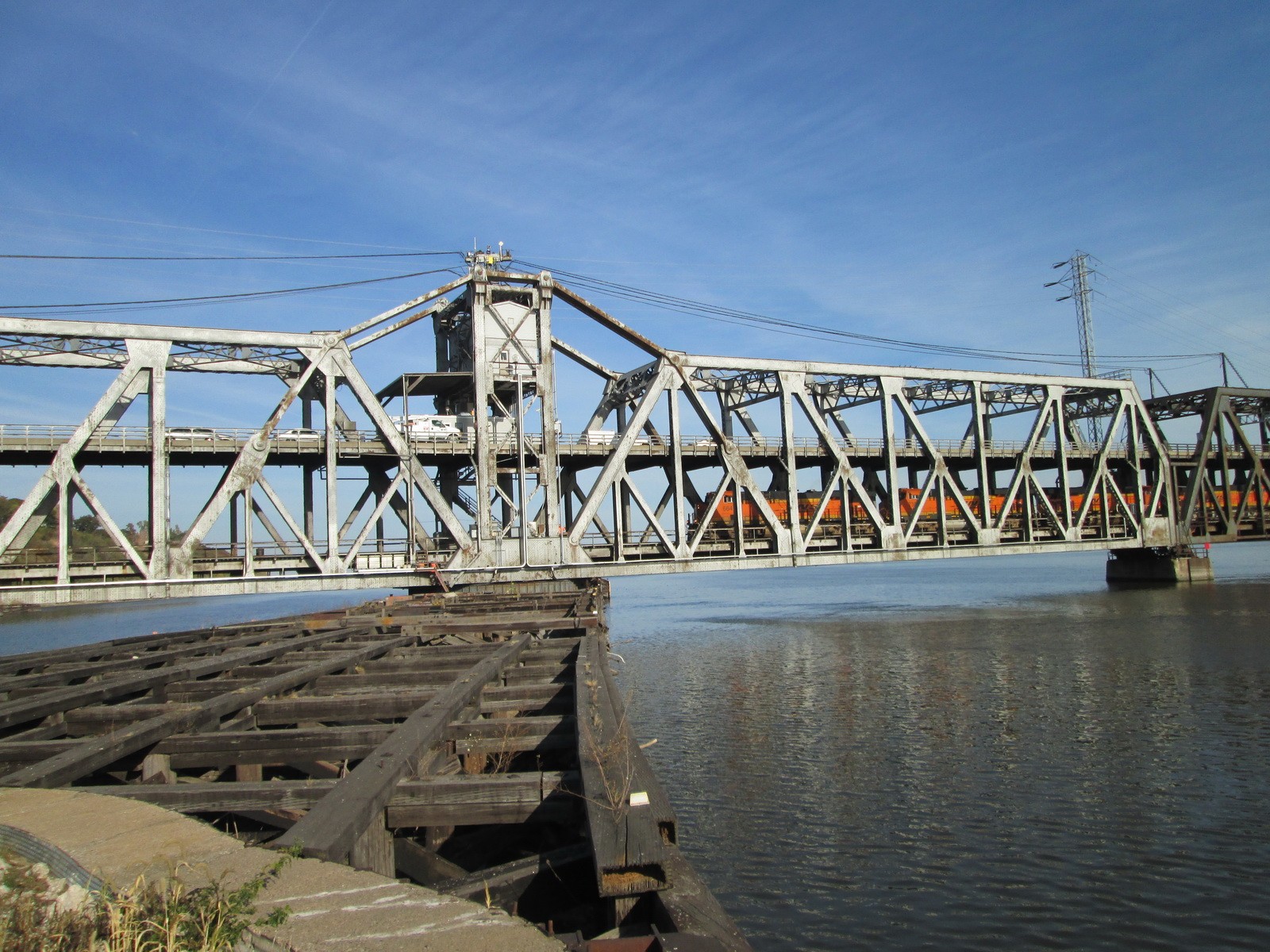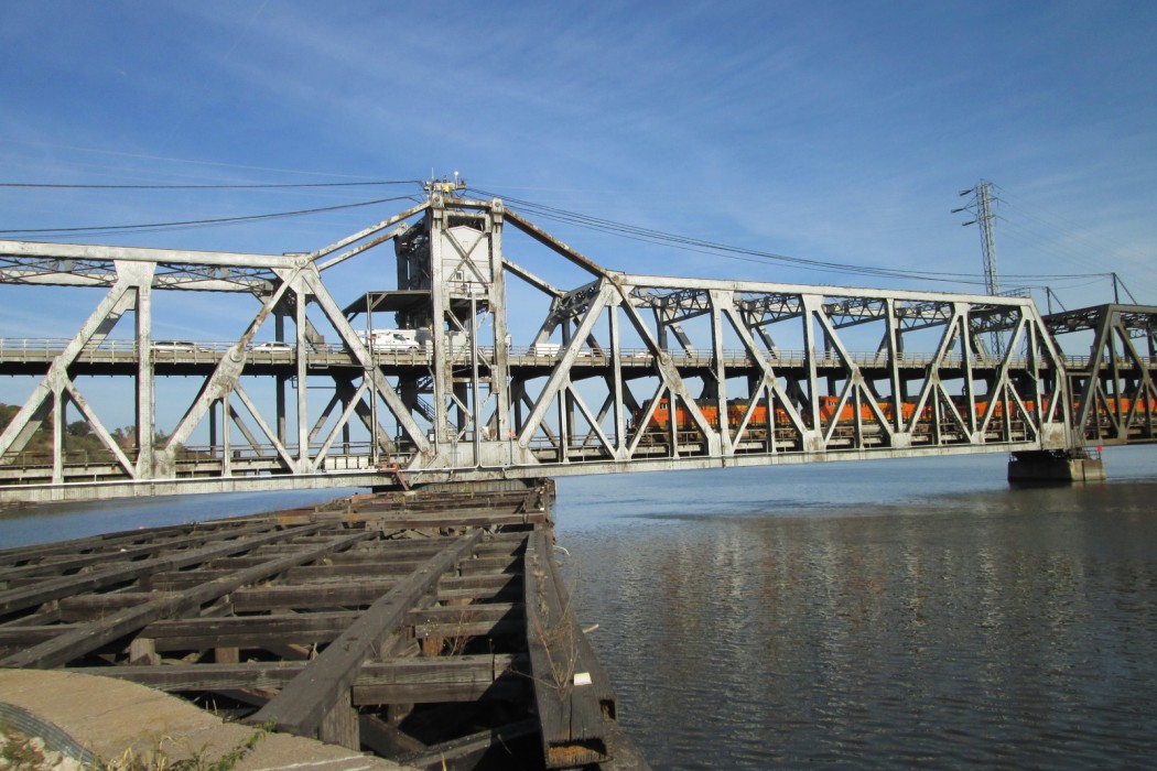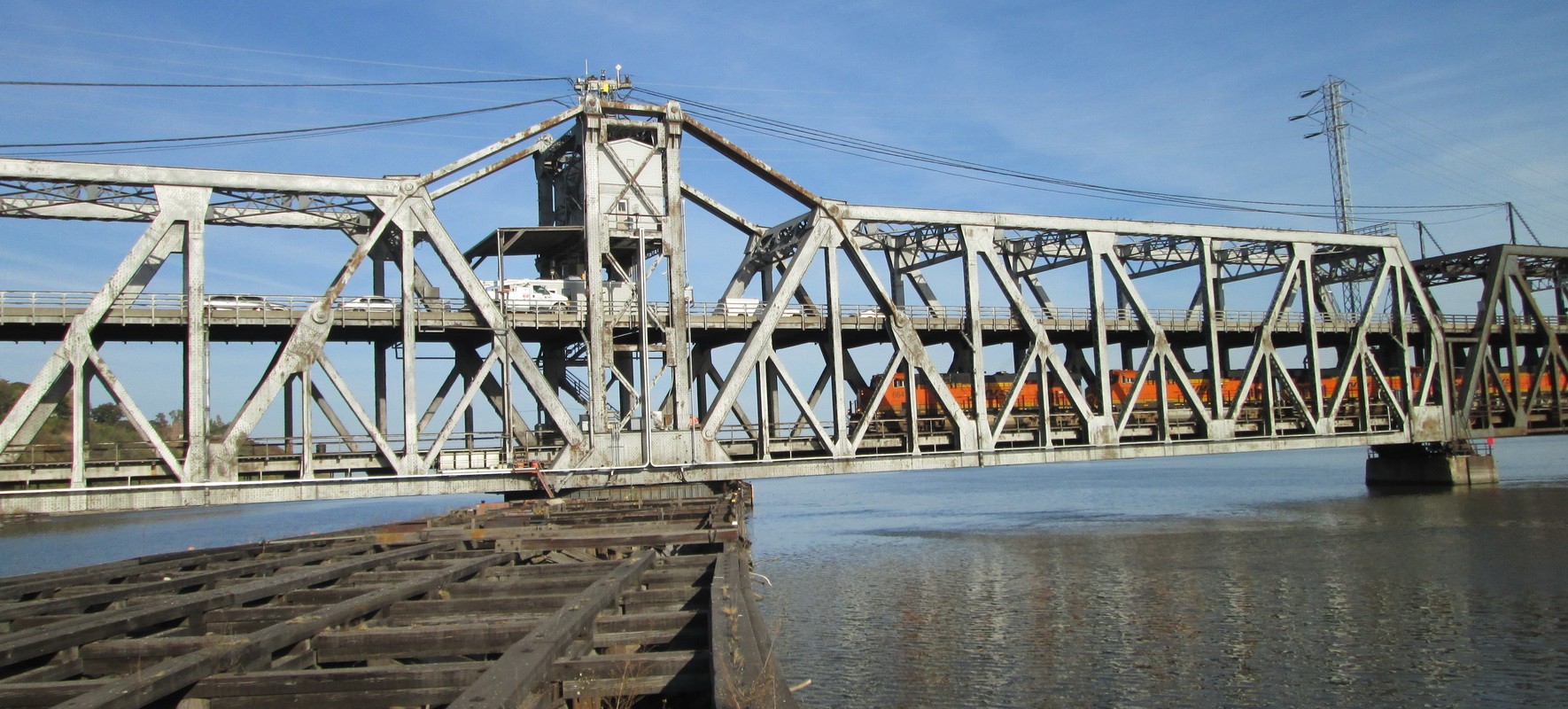 Completed in 1927, Fort Madison Toll Bridge—also known as the Santa Fe Swing Span Bridge—is a double-decker swing-span bridge over the Mississippi River that connects Fort Madison, Iowa, with Niota, Illinois. Privately owned by BNSF Railway, the swinging truss bridge has a two-lane highway on the upper deck and a two-track freight railroad on the lower deck. The bridge machinery and electrical operating systems are located on the moving structure and consist of bridge drive motors and brakes, rail lock motors, and end lift motors. Bridge approaches are provided with vehicular traffic control and navigation lighting. The bridge is provided with a local electric utility service and a fully rated on-site standby generator.