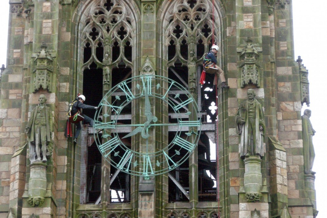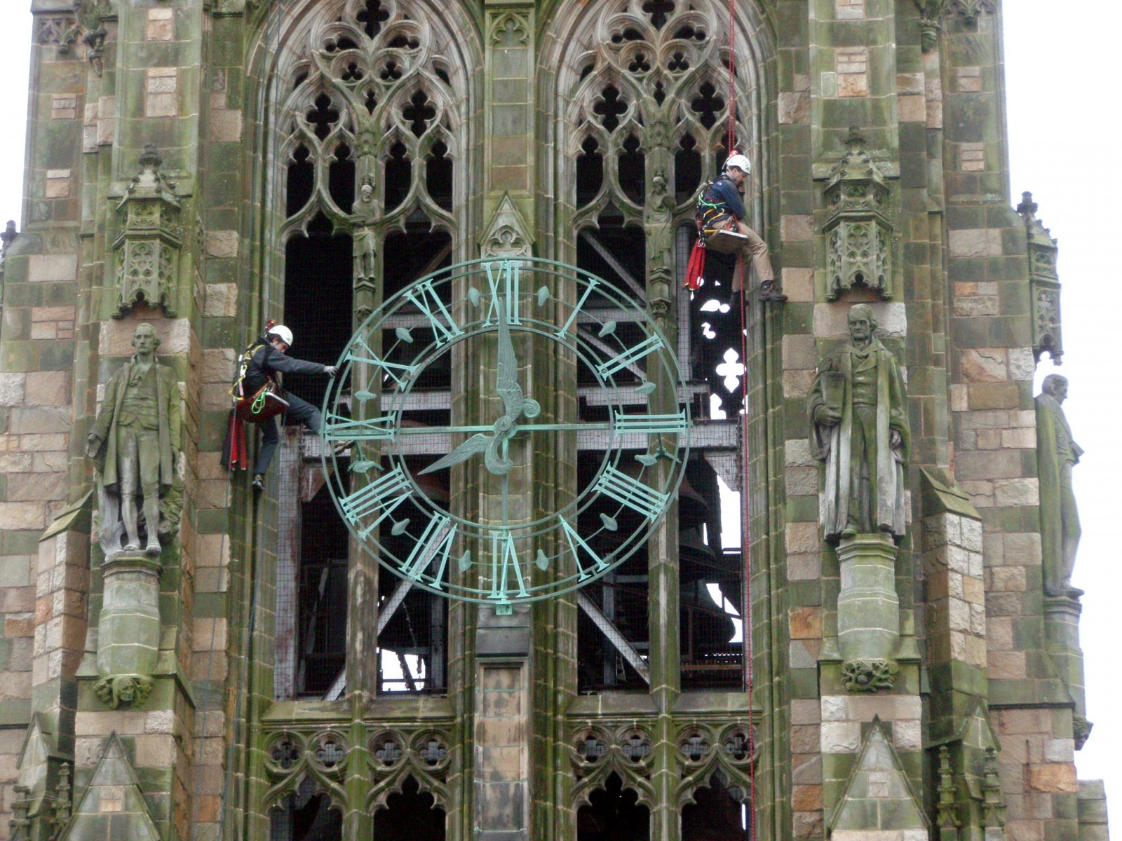 Utilizing the Difficult Access Team, WJE's investigation revealed extensive organic growth at the north side of the tower; erosion and spalling of the sandstone and brick; significant cracks in the granite at the tower's corner buttresses; loose, missing, and cracked mortar; spalling of concrete at roof and floor decks; steel corrosion at doors and windows; bowing of lead cames at the stained glass window; loose and missing clay tile at louvers; and loose quarry tile and failed mortar beds at the roof, balconies, and floors exposed to the exterior. WJE also observed that the lightning protection system was in disrepair.