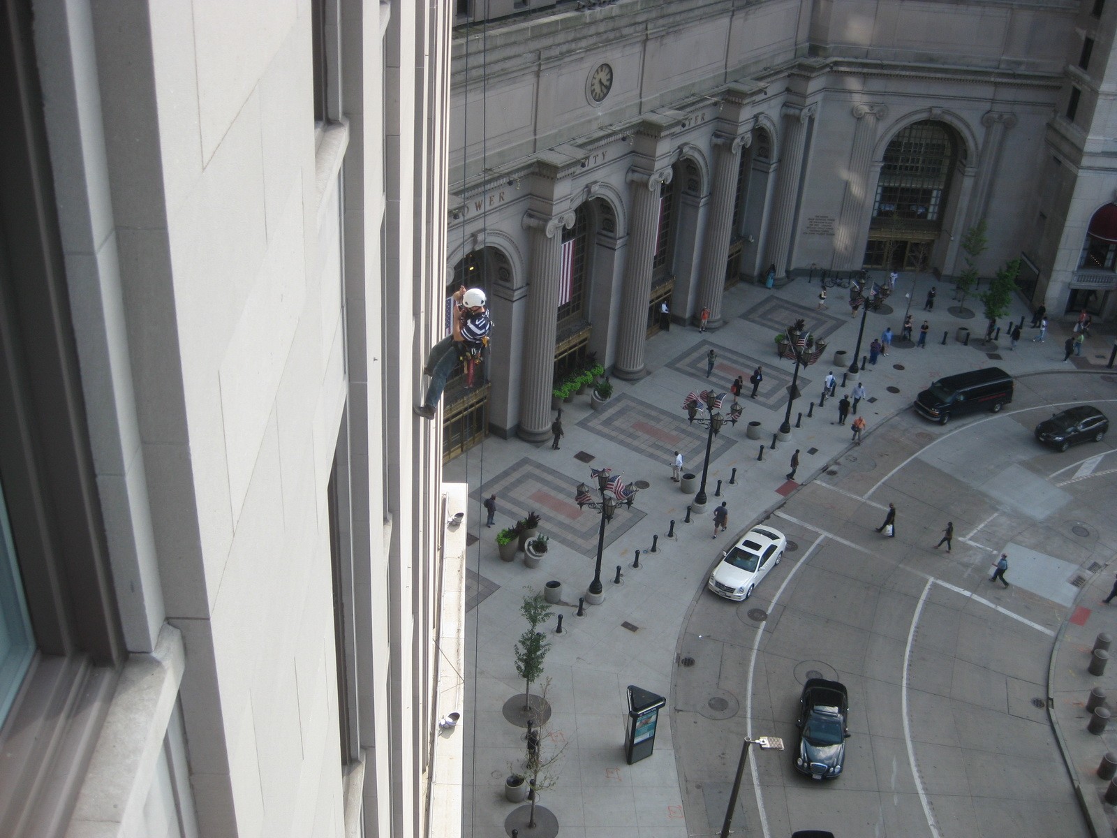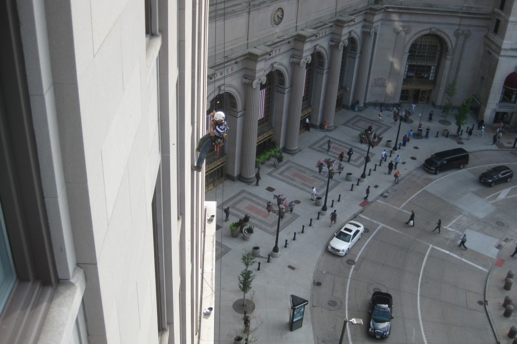 WJE performed a visual condition assessment of the cladding and window systems from the ground using binoculars and from adjacent buildings or roof setbacks. Close range assessment of the facade was performed at select locations by means of industrial rope access techniques. Interior spaces were also examined for evidence of water infiltration or deteriorated conditions.
