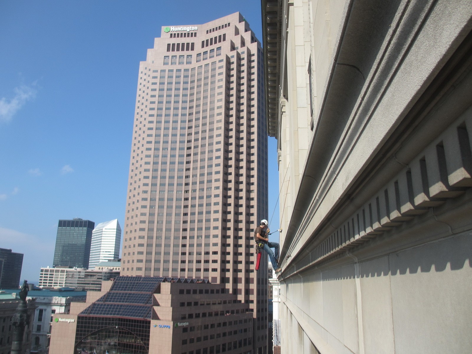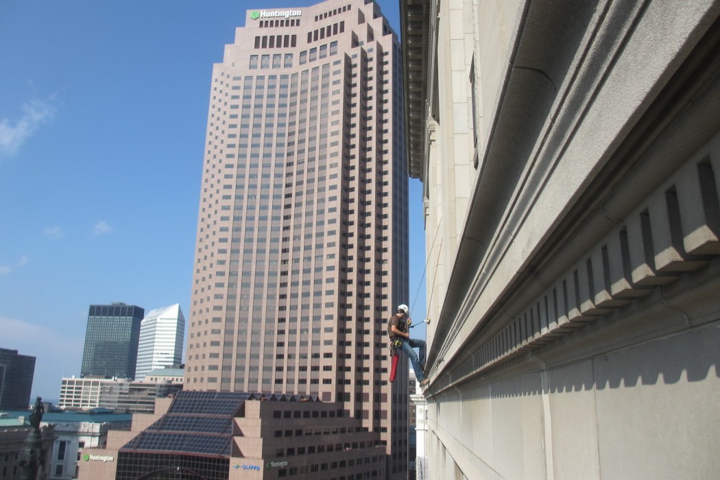 The Higbee Building was constructed in 1931 as part of the now Tower City Center complex, bordering Public Square in downtown Cleveland. The fourteen-story building has had numerous tenants since its construction and had undergone multiple renovations prior to WJE's involvement. The building facade is clad primarily with limestone panels and ornamental terra cotta and includes punched windows and doors of various vintages and types.