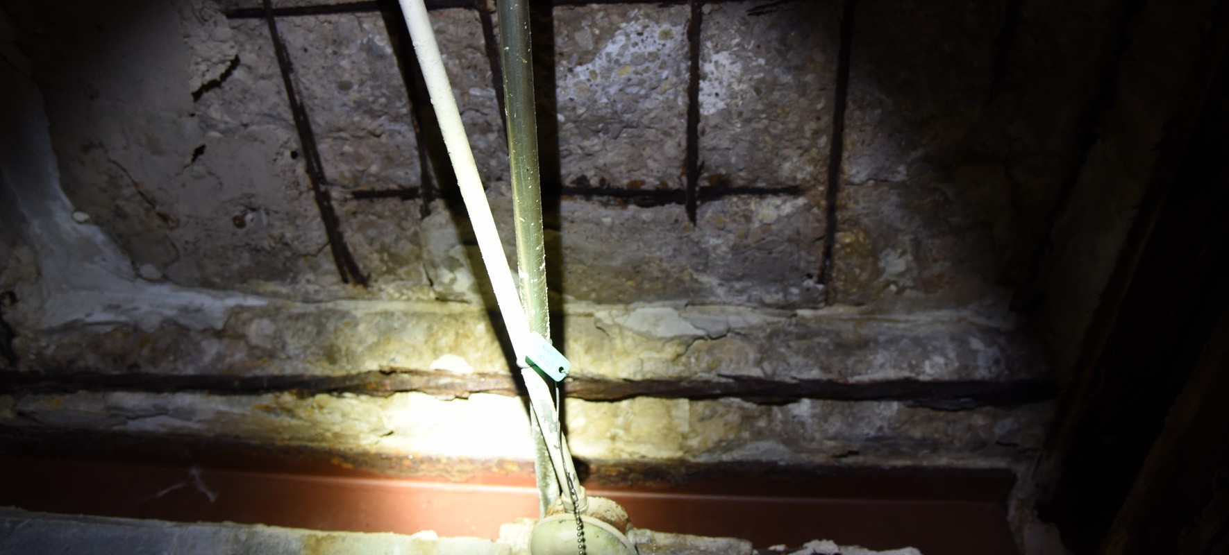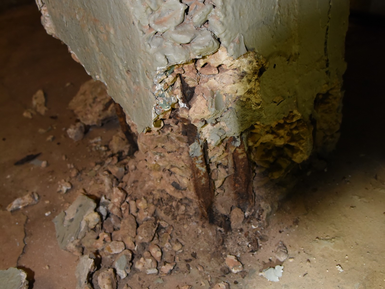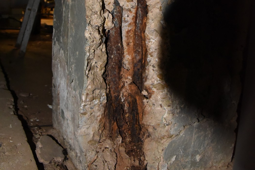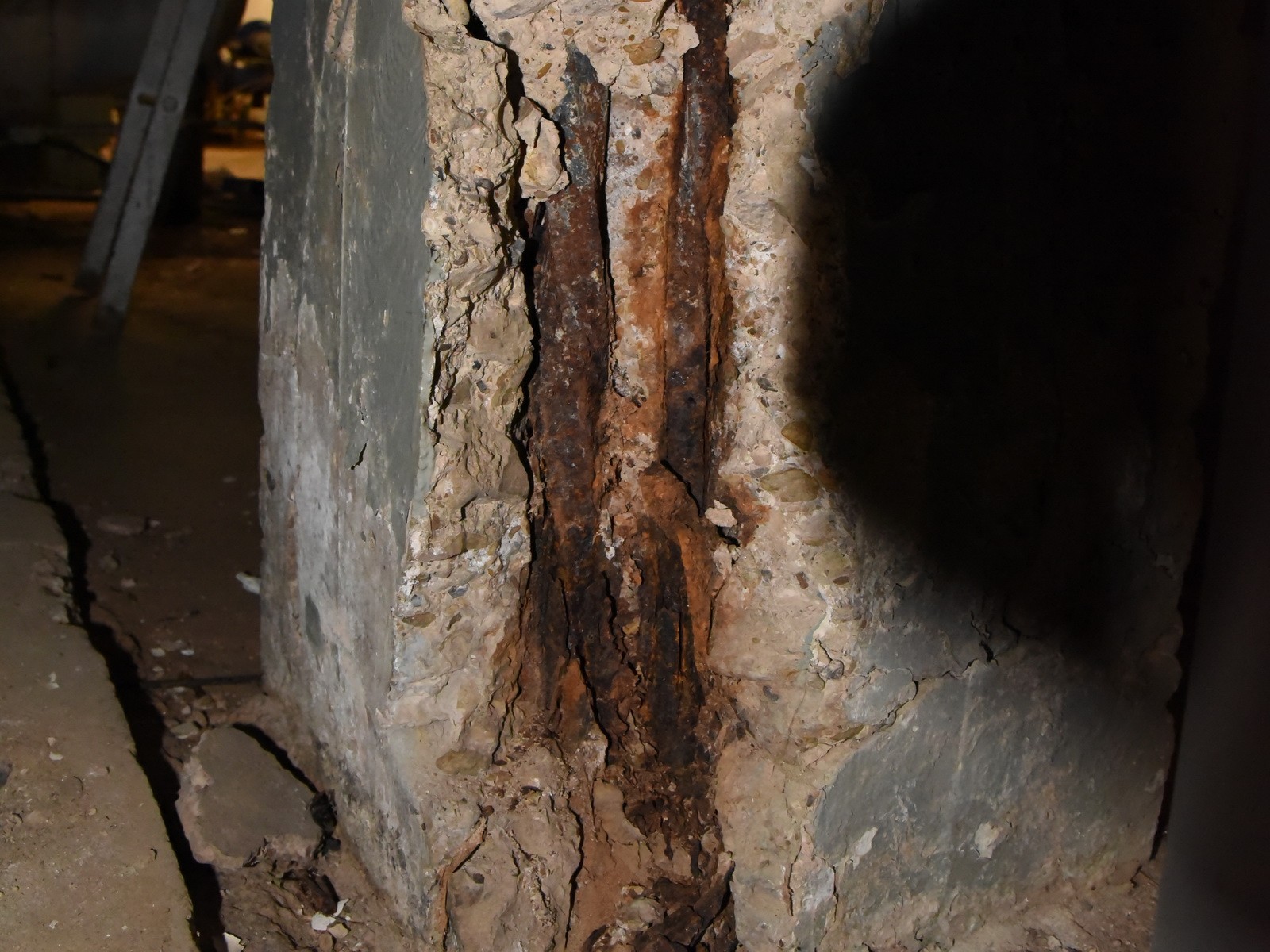 WJE investigation determined that the deteriorated columns did not have significant reserve capacity beyond the existing loads imposed on them. The deterioration was determined to have arisen in this isolated area due to the proximity of the columns to the original boiler and the occasional flooding of the area. The heat and carbon dioxide/carbon monoxide from the boiler, plus the occasional presence of moisture, resulted in accelerated aging and carbonation of the concrete and corrosion of the steel reinforcing bars within the column.