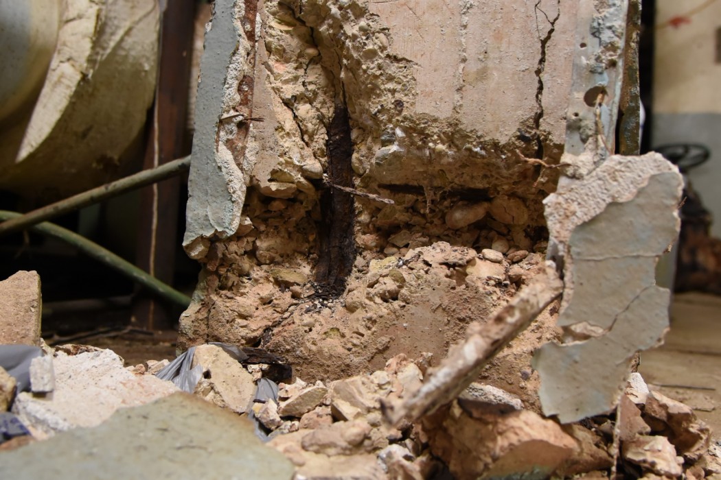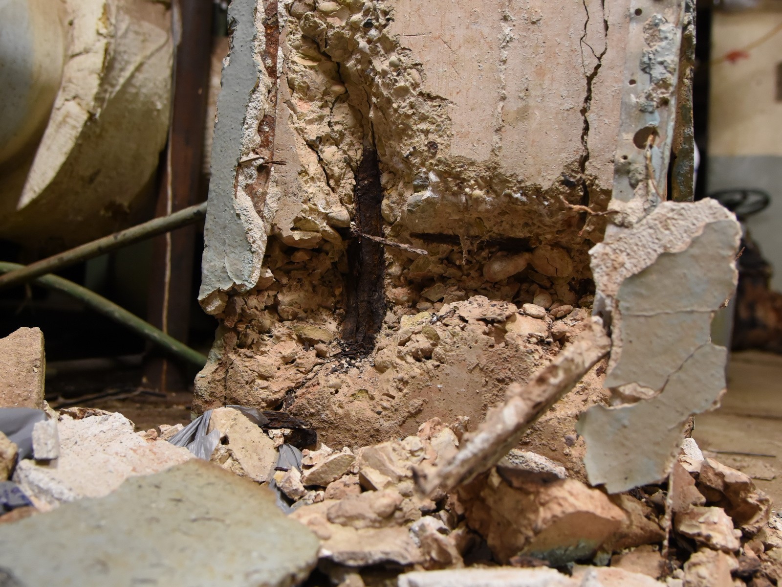 The three distressed columns each originally had a concrete cross section measuring about 12 inches by 12 inches. The columns supported a cast-in-place concrete filigree slab for the first floor. Prior renovations removed the roof load from these columns.