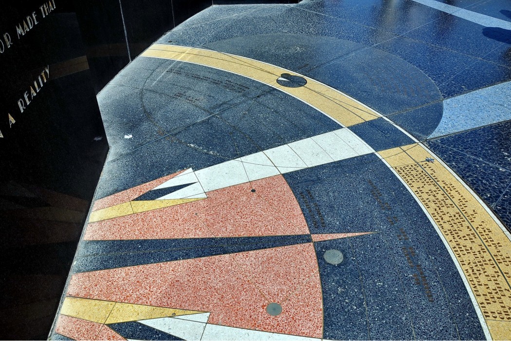The plaza paving is composed of cementitious terrazzo with an elaborate inlaid celestial map that is meant to depict the exact position of prominent stars, constellations, and planets in the Northern Hemisphere at the date and time at which President Franklin Delano Roosevelt dedicated Hoover Dam. The plaza features two 30-foot-tall bronze Winged Figures of the Republic, a flagpole set on a diorite granite base, and a terrazzo-clad precast concrete terrestrial compass with twelve bronze plaques, each representing a sign of the zodiac.