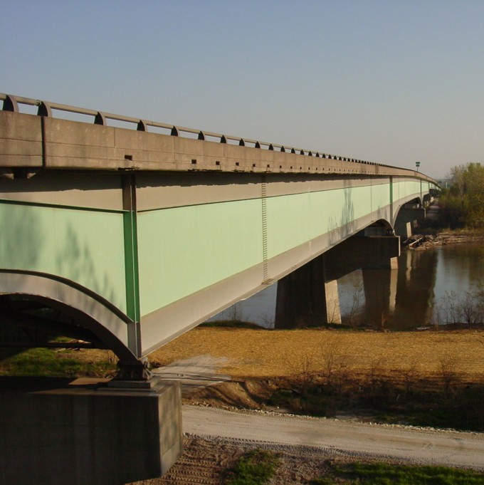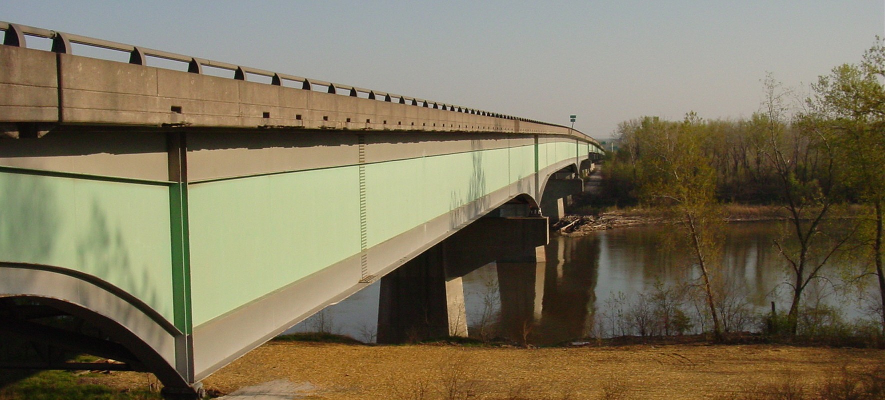 The I-435 Bridge features seven bridge units and comprises parallel two-girder spans with a total length of 3,619 feet.