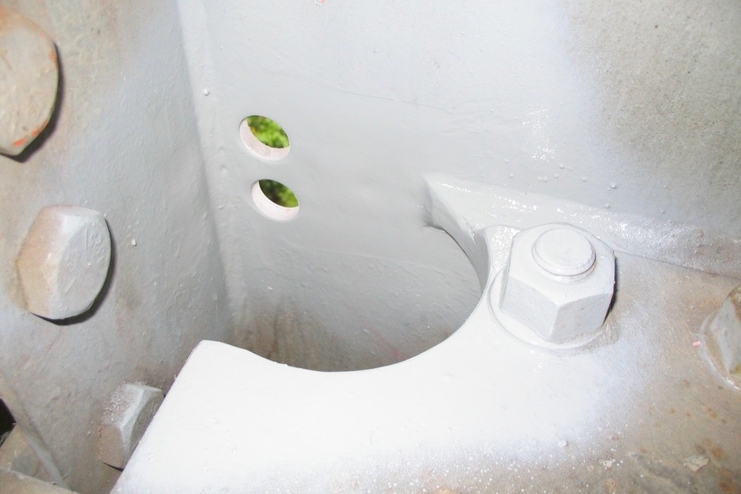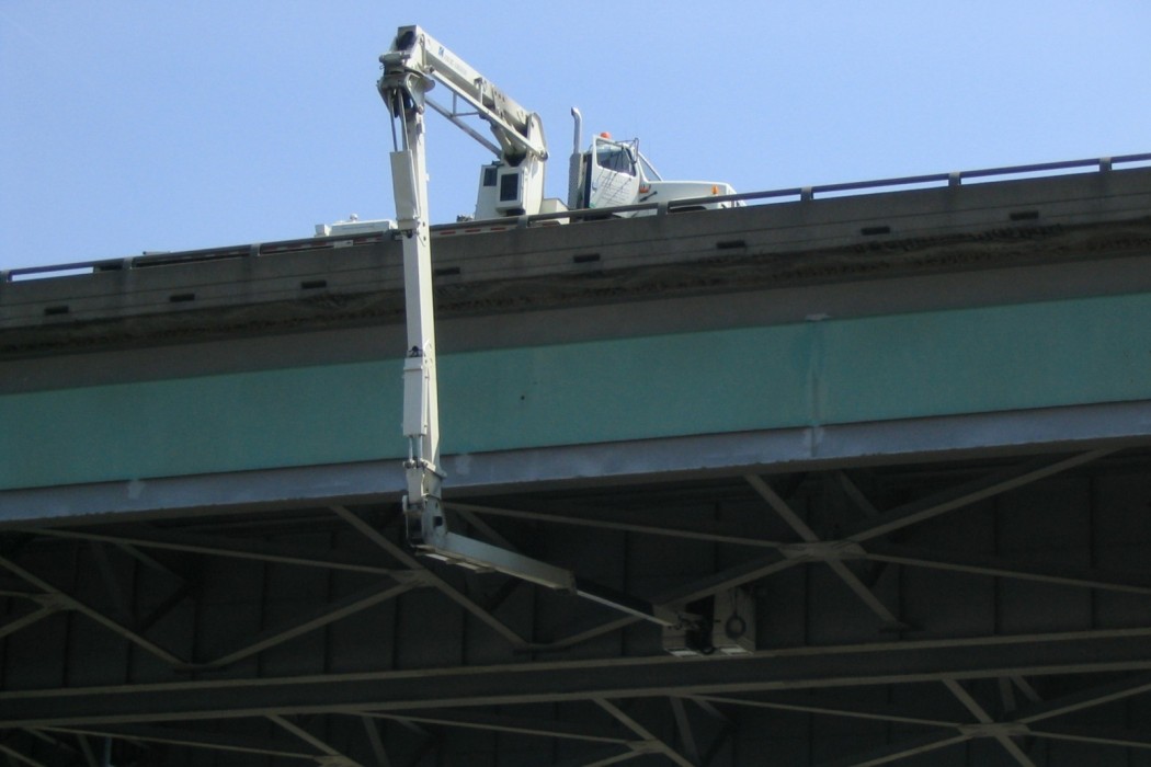 WJE performed a comprehensive evaluation of the bridge. Hands-on inspections were performed using visual and magnetic particle test methods. Light grinding was performed at locations where paint or weld overlaps obscured visual inspection access. Cracking was identified at more than seventy-five locations, including some locations with multiple cracks. A testing program was then carried out to measure the live load response of the structure at selected details. This program included instrumentation to monitor more than 150 strain gage and displacement channels during twenty-one separate test setups located throughout the bridge. Measurements were made under both control truck loadings and normal traffic. Based on the inspection and testing results, WJE engineers concluded that the cracking resulted from out-of-plane displacement and restraint forces at connections of various floor beams and lateral members to the main girders. The engineers then developed redundancy retrofit options as well as long-term fatigue and fracture retrofits to address fatigue-sensitive details. In the final phase of the project, WJE was retained under a specialty engineering contract to retrofit details susceptible to distortion-induced cracking or fracture due to high residual stresses or embedded defects. WJE crews installed several hundred retrofits throughout the bridge, including crack arrest holes, weld repairs, and core drilling of connection elements.