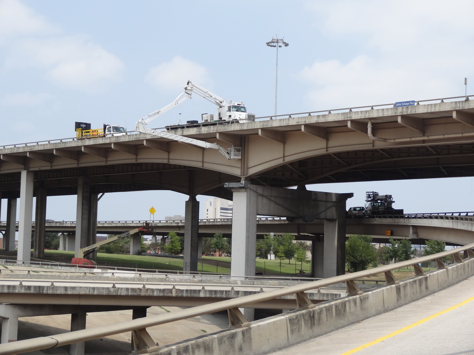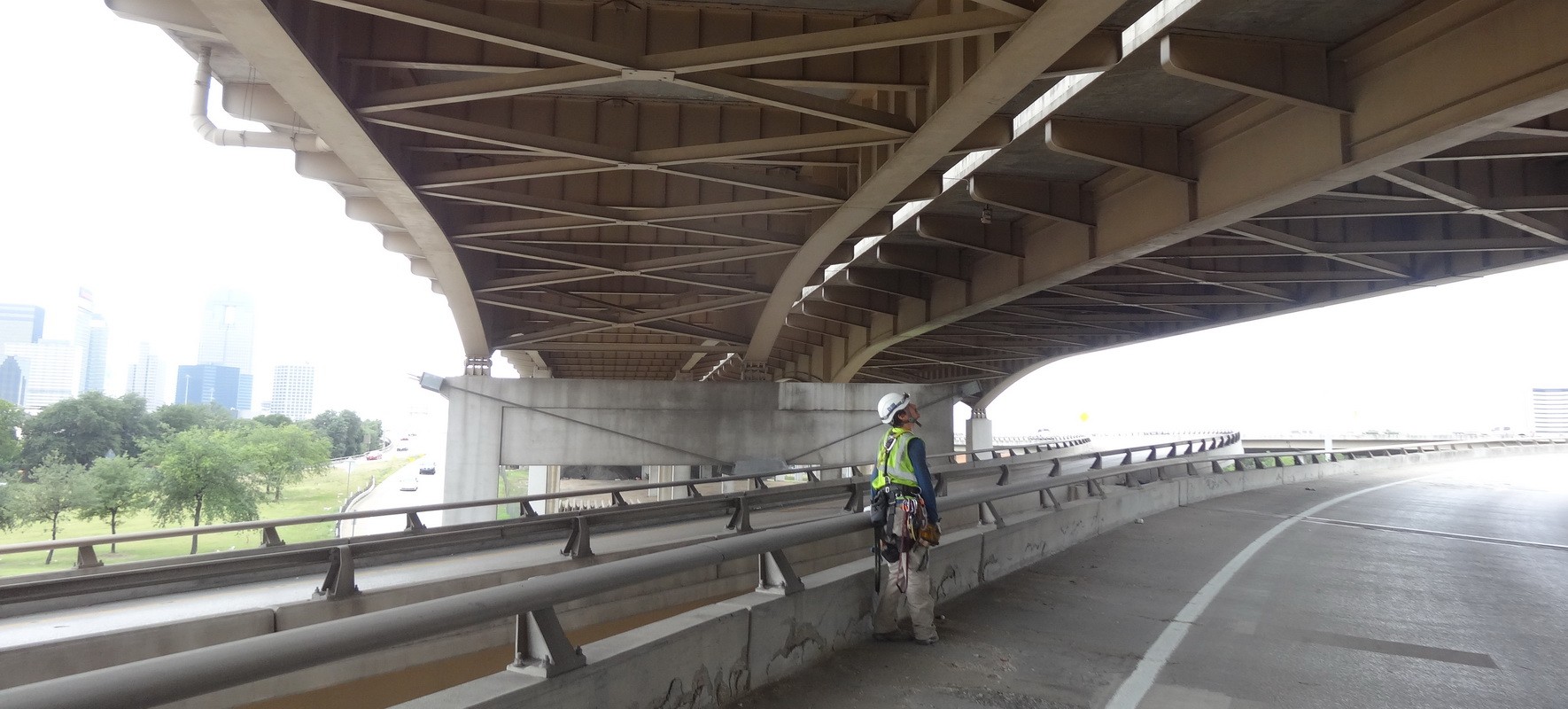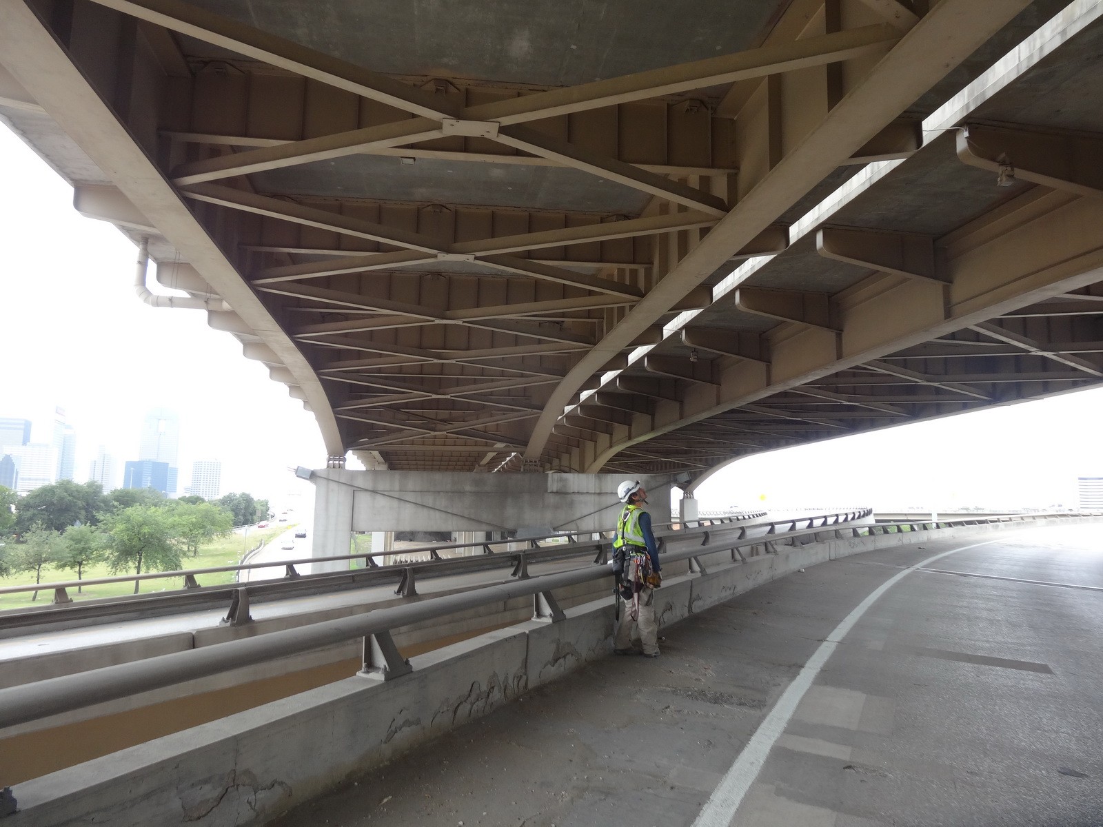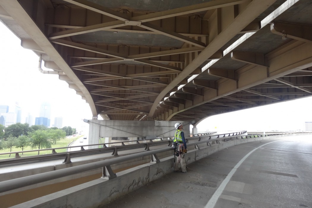 Completed in 1971, the 1.6-mile steel structure connects I-35, I-45, and US 75 with local city streets. Its sixty-five units typically consist of two welded plate girders in two to four continuous span units. Floor beams with cantilevers support a transversely and longitudinally post-tensioned (PT) concrete deck. The structure is primarily supported on individual concrete column piers, often offset to accommodate city roadways below.