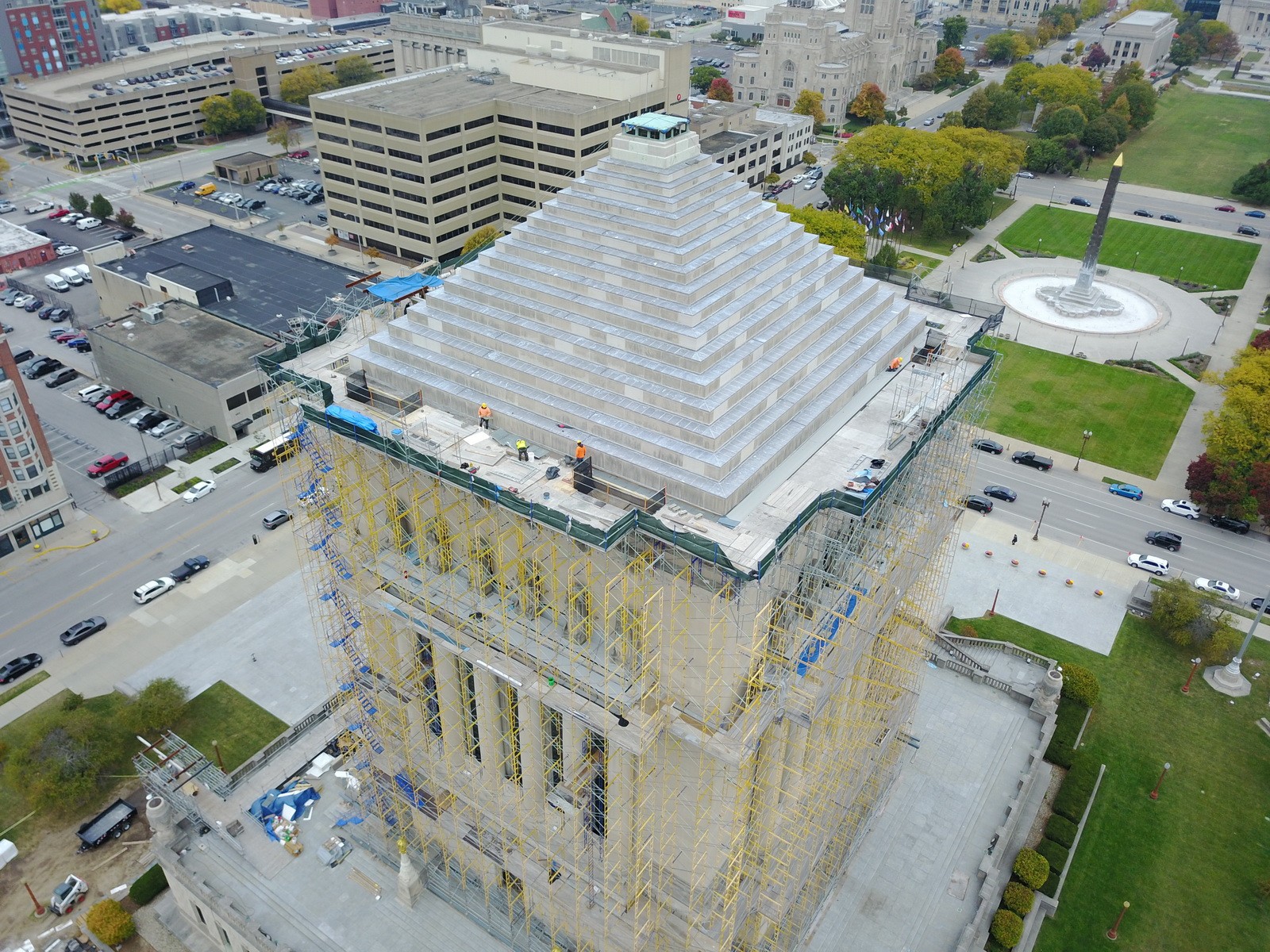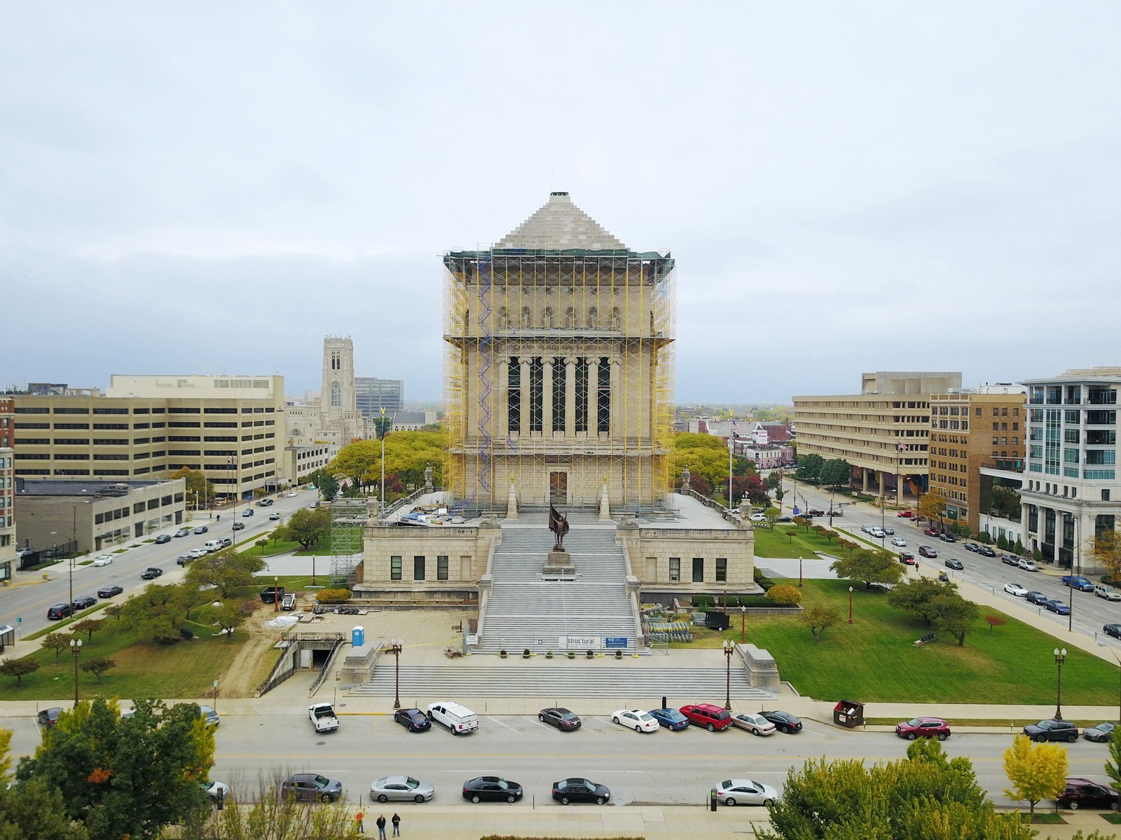 The Indiana War Memorial (IWM) occupies one city block and sits in the center of the five-block Indiana War Memorial Plaza Historic District. Designed by Walker and Weeks, construction of the IWM commenced in 1926, but was not fully completed until 1965. The IWM consists of a mausoleum structure that sits atop a plaza deck and auditorium. The mausoleum structure has three distinct roof areas, which include the ziggurat steps, statuary level above the colonnade, and between columns at the base of the colonnade.