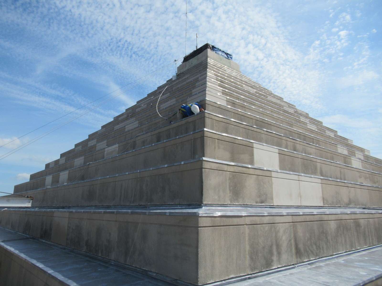 Based on WJE’s assessment, water leakage into the interior of the building at the ziggurat steps was a result of distress and deficiencies in the original lead flashings, lead flat-lock panels, and low-sloped roofing systems. WJE also noted distress to limestone cladding units at the ziggurat resulting from corrosion of anchorage.