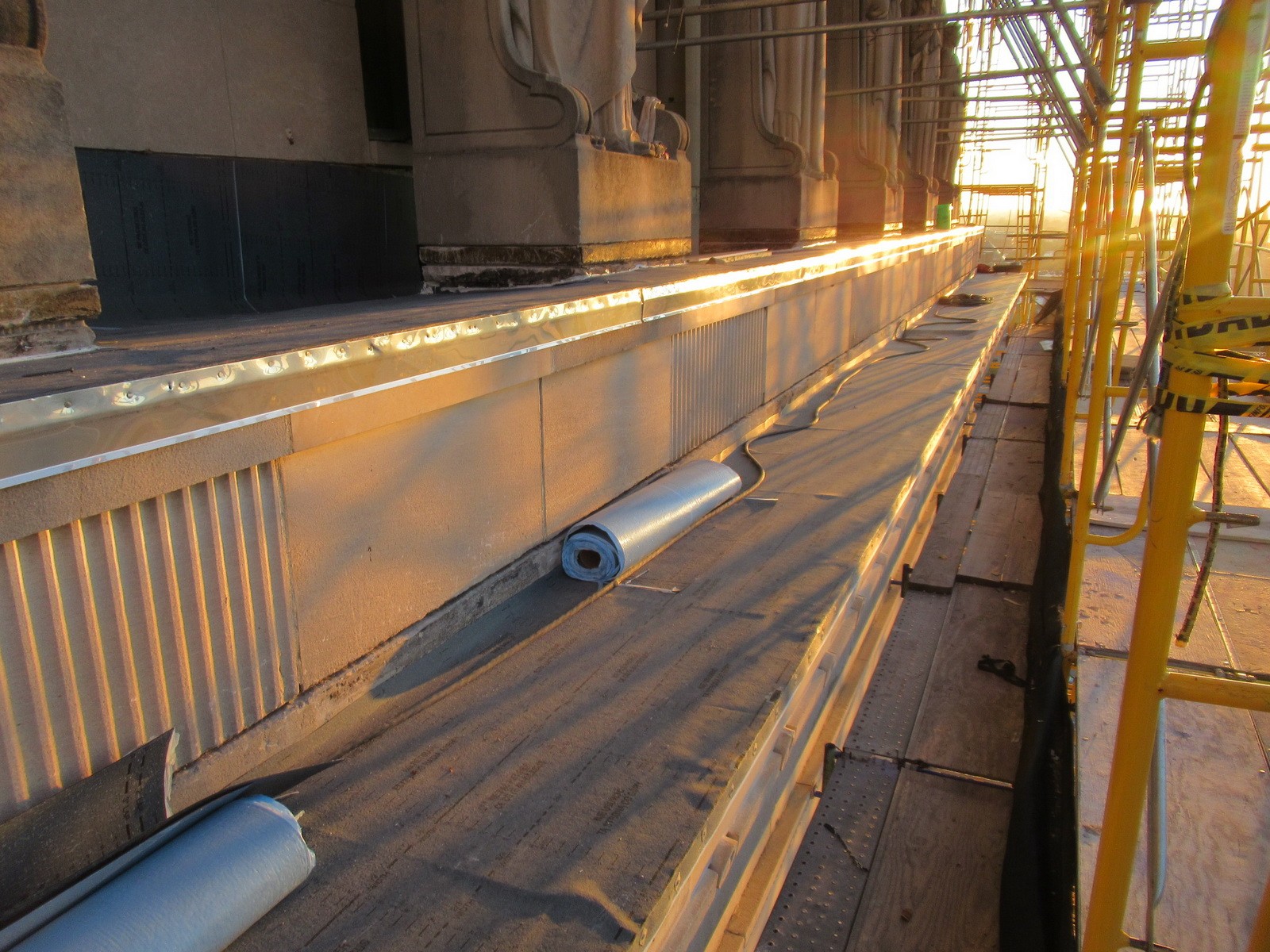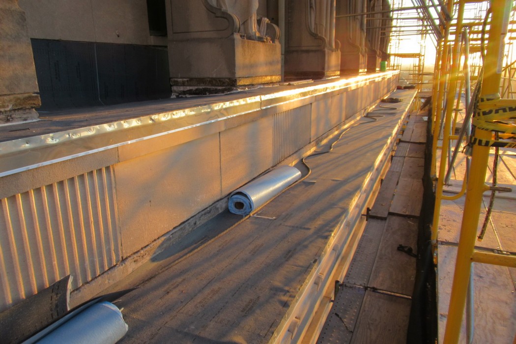 WJE’s Difficult Access Team assessed the reported water infiltration and existing conditions at the interior and exterior areas. Investigative openings at locations in the exterior limestone and lead sheet flashing were utilized to identify the source of the leakage.