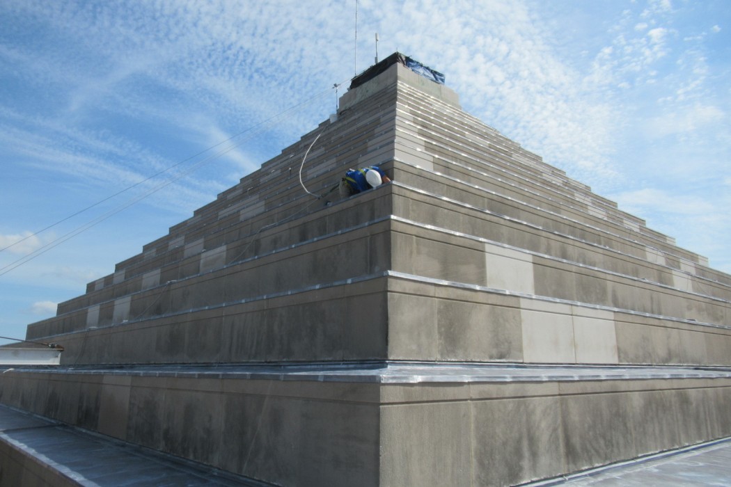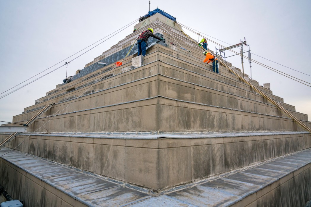 WJE developed construction documents to replace the roofing systems and remove all limestone cladding at the ziggurat, incorporate a new waterproofing membrane below the cladding, and install new lead-coated copper flashings.