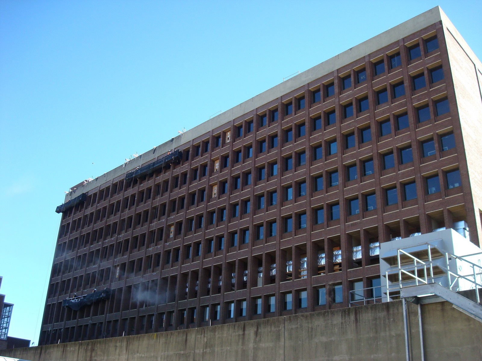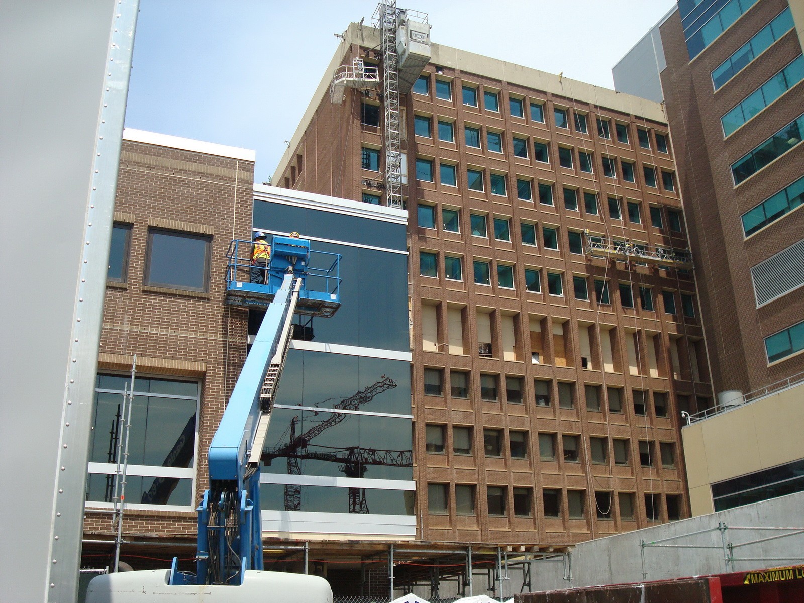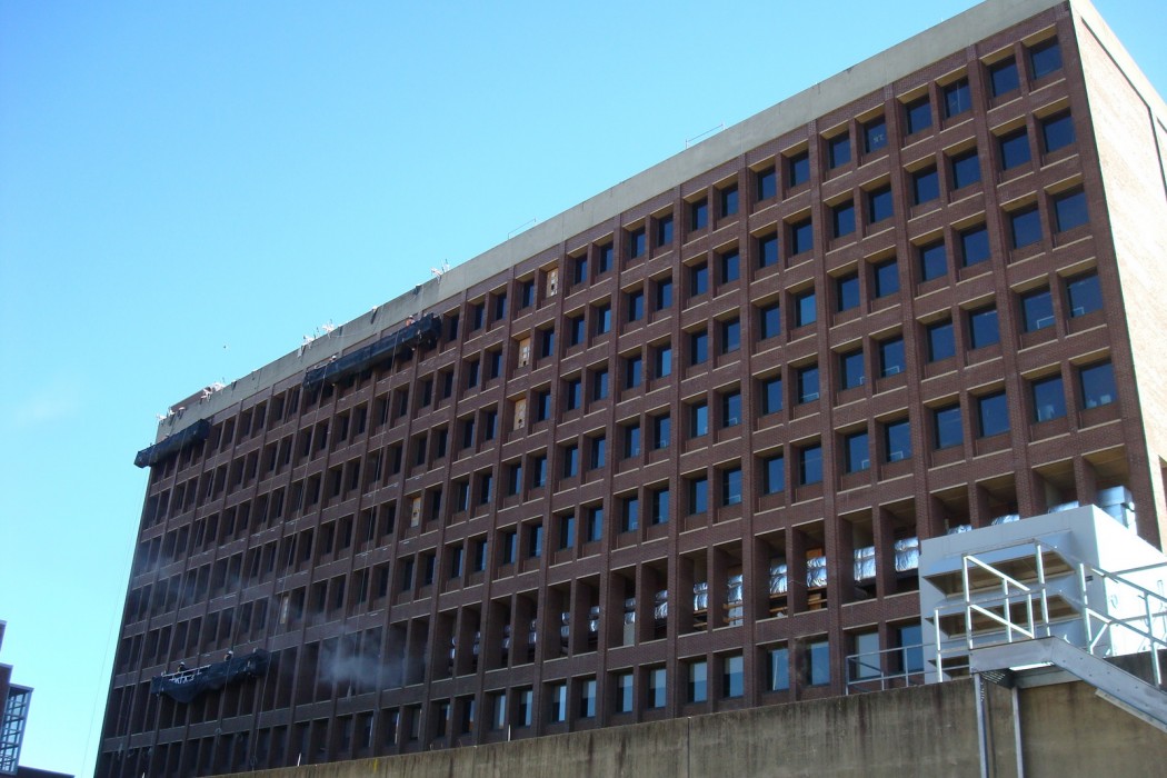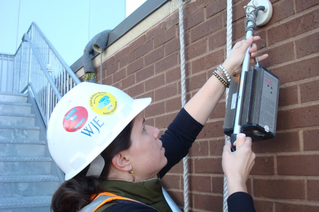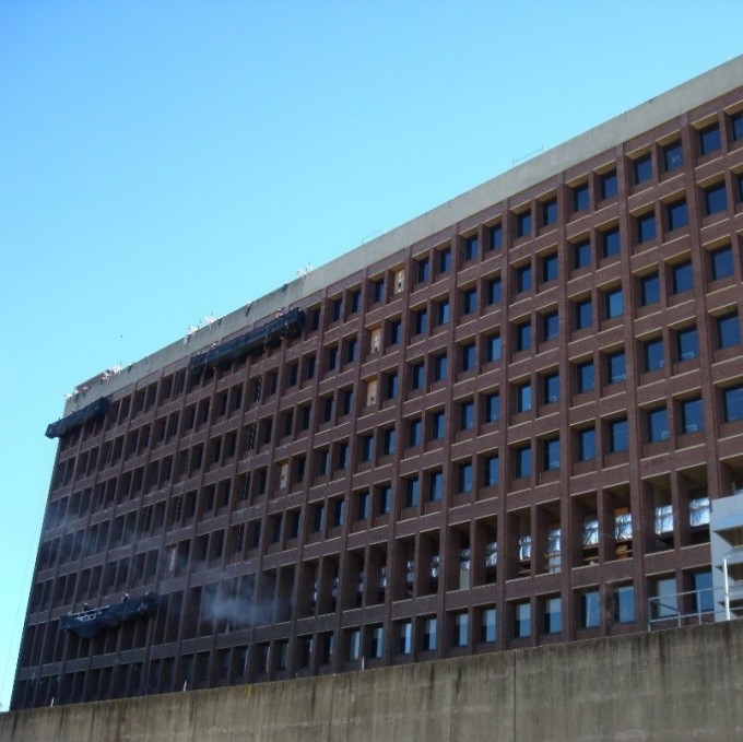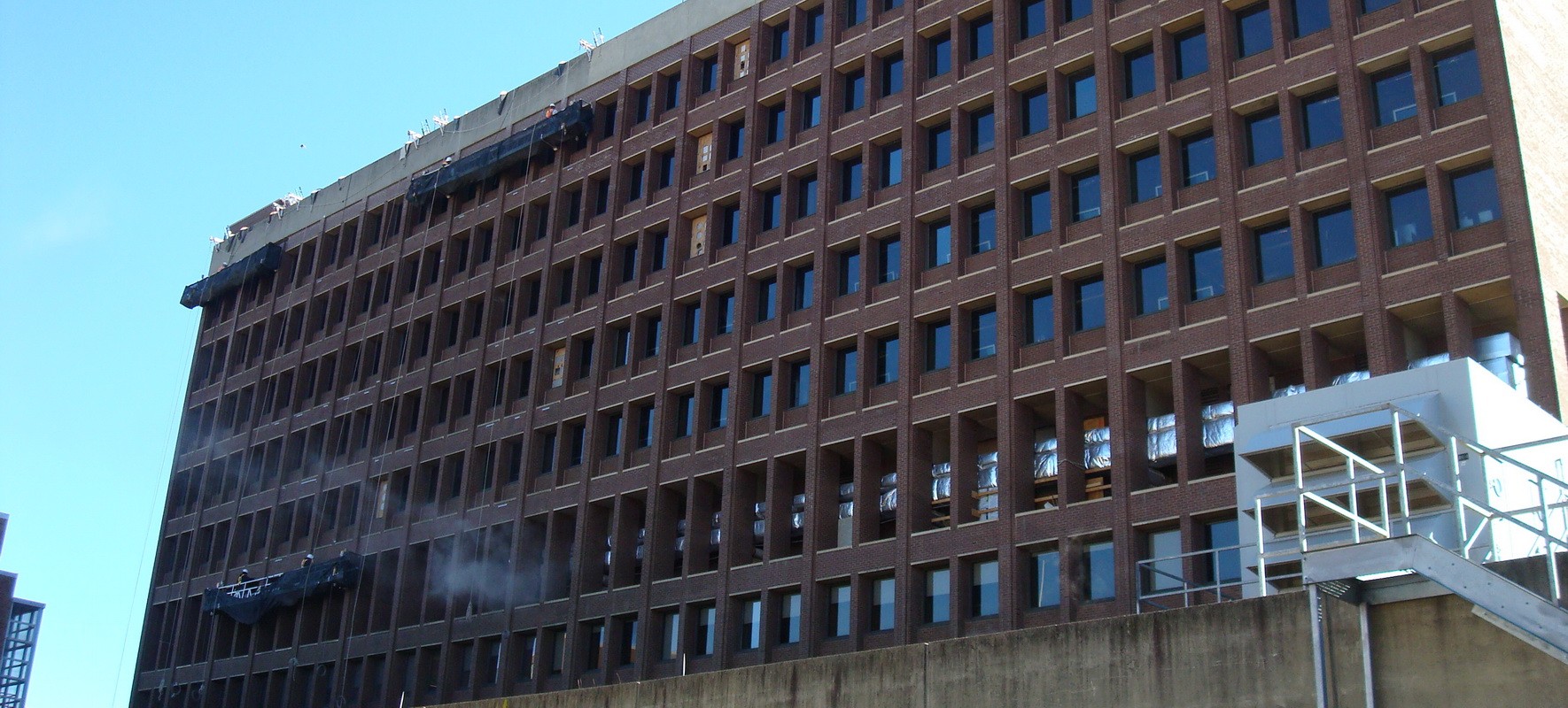 WJE also reviewed the masonry at close range from swing stages, pipe scaffolding, etc. to assess locations for masonry repair allowance work and performed regular site visits to observe the work in progress and to verify that the construction was in general accordance with the contract documents.