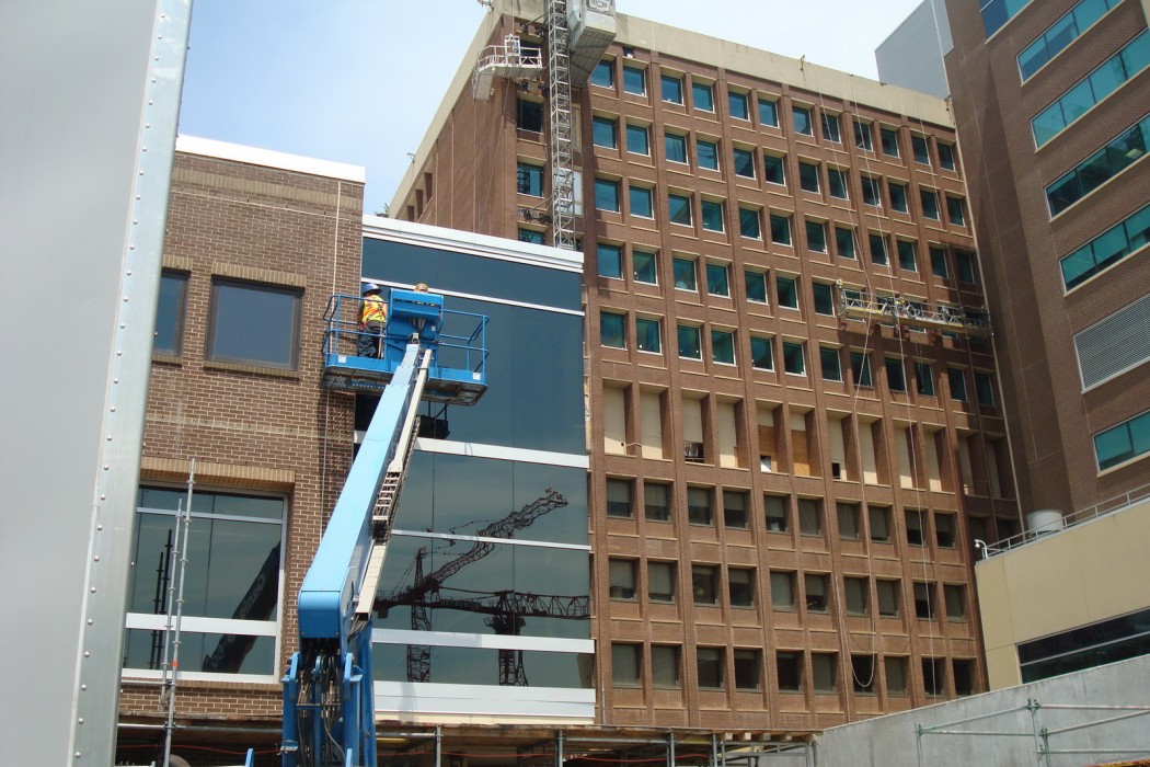 Rainwater penetration was reported throughout the Critical Care Wing as well as at the roof of the North Tower. WJE was asked to provide investigative services and to perform a facade condition survey in support of the renovation work. WJE was then retained by Inova Design and Construction to provide exterior enclosure consulting services during the $70 million renovation to mitigate the risk for uncontrolled rainwater penetration and moisture ingress, condensation, and moisture-laden air flow through the newly renovated enclosures.