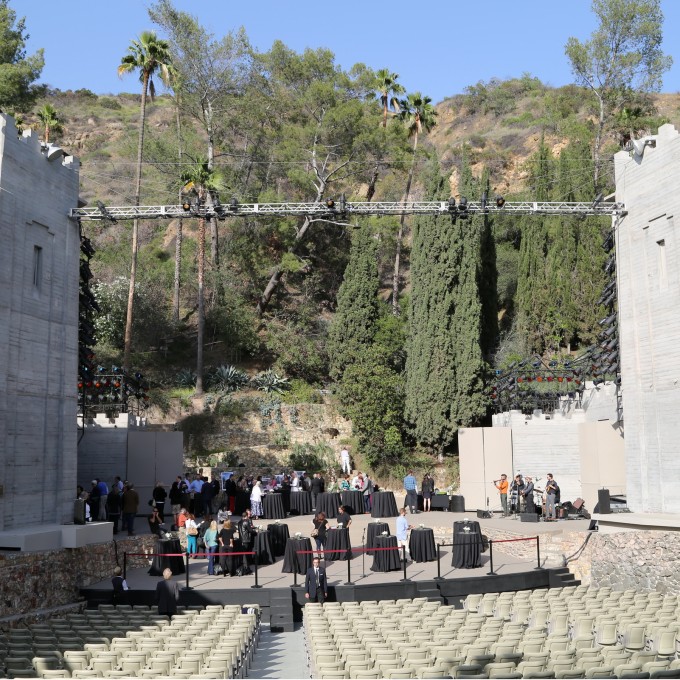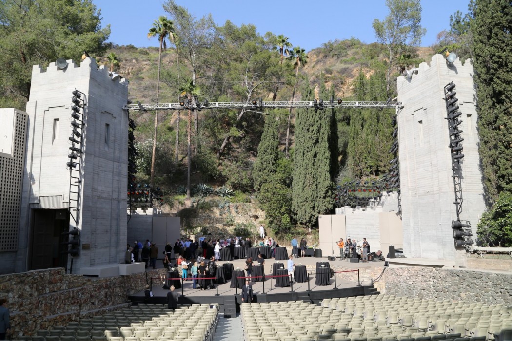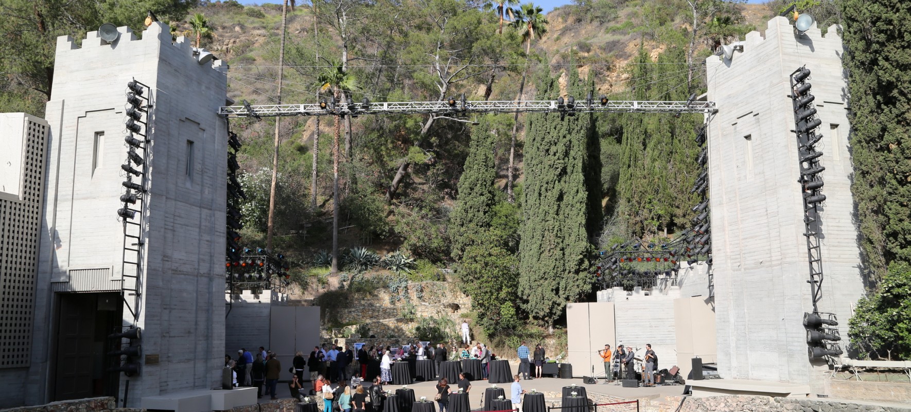 Originally built in 1920, the 1,200-seat outdoor amphitheater was rebuilt and reopened on the same site in 1931. The rebuilt theatre was constructed of cast-in-place reinforced concrete, and the major architectural elements were designed to resemble the gates of Jerusalem. In 1976, the performance venue was named the John Anson Ford Theatre in honor of a Los Angeles County Supervisor who was a great supporter of the arts. Living cypress trees and chaparral shrubs are held in place with a series of retaining walls and form the back "wall" of the concrete stage. It is one of the oldest in-use performing arts venues in Los Angeles.