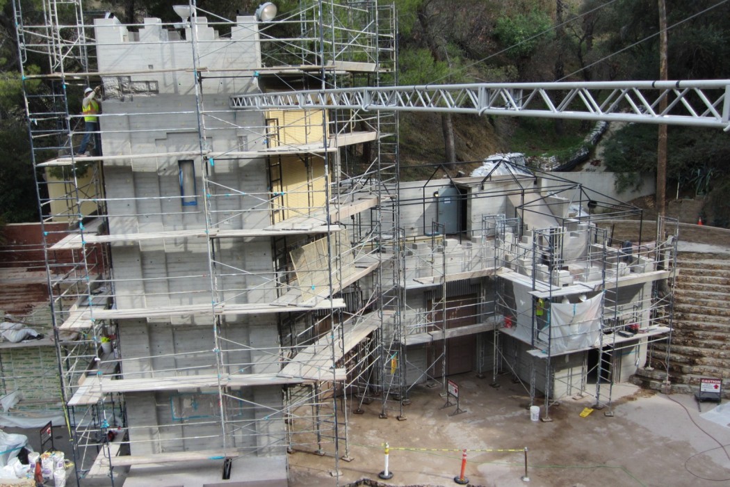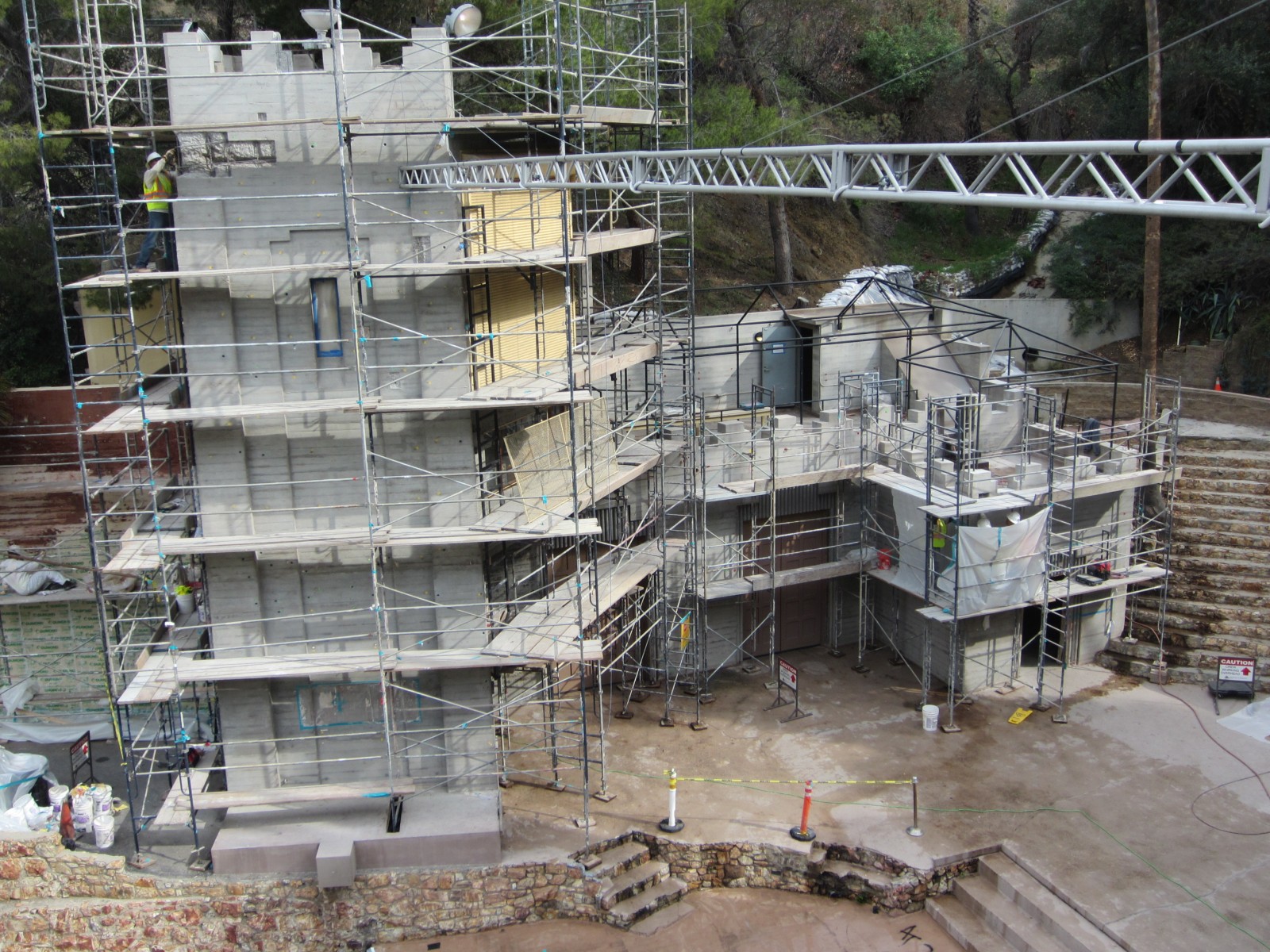 To repair the exterior historic concrete walls of the stage structures, the existing coating was removed and the historic concrete was repaired with custom pre-bagged repair material developed to match the original concrete. To match the range of original concrete composition, two different custom mixes were selected.
