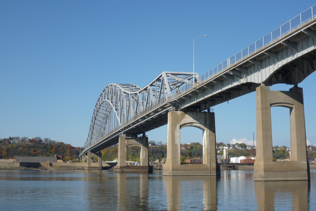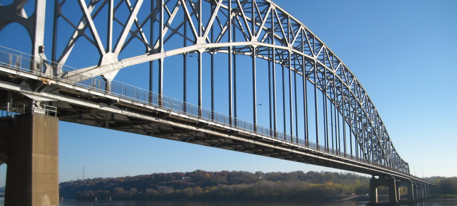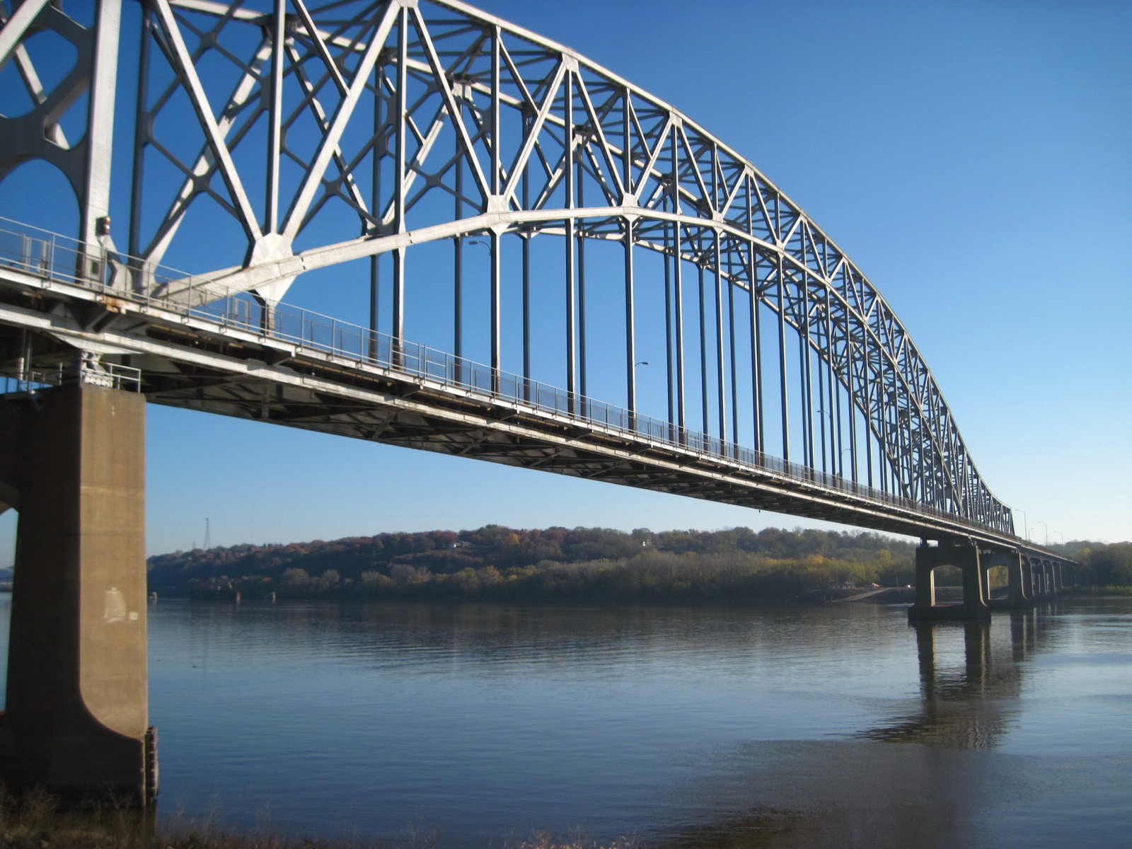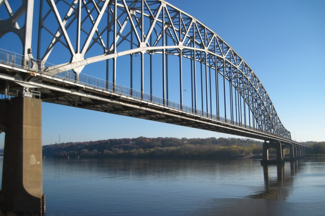 The 5,635-foot-long Julien Dubuque Bridge carries two lanes of U.S. 20 over the Mississippi River between East Dubuque, Illinois, and Dubuque, Iowa. The east approach consists of twenty-three two-girder spans that are 2,773 feet long. The main structure is a 1,539-foot-long continuous three-span arch truss. The west approach consists of six multi-beam spans, measuring 387 feet long, and seven two-girder spans, measuring 936 feet long. The riveted structure was built in 1943 and has been modified several times.